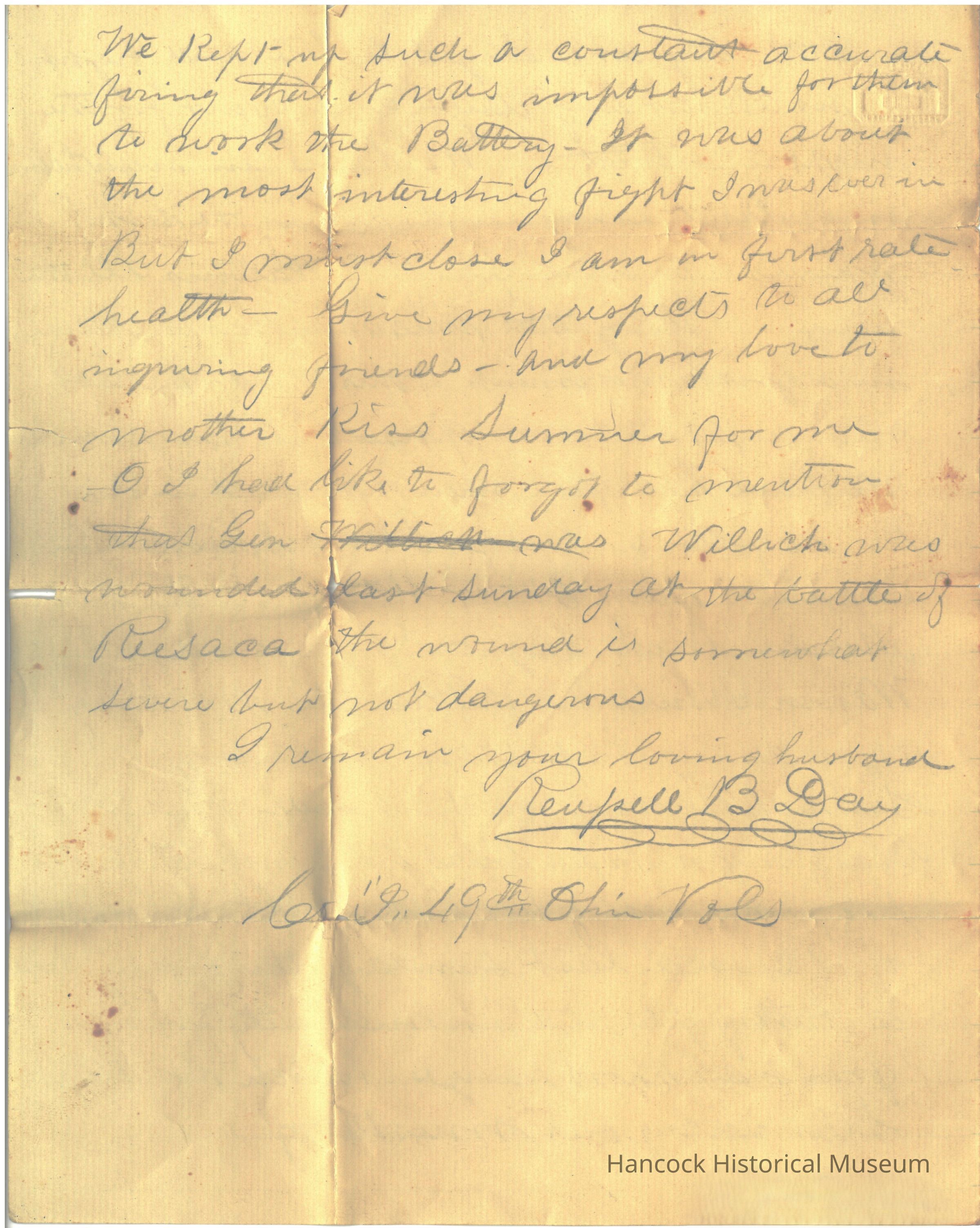 The image shows a handwritten letter on yellowed paper with a visible center fold, written in cursive script. The text discusses a recent battle, mentioning the constant and accurate firing of the enemy, making it impossible for them to take the battery. The writer expresses admiration for the fight, describing it as interesting. The letter concludes with personal messages, including well-wishes for friends and specific instructions to extend love to the writer’s mother, along with a note about a General Willich who was wounded. The wound is described as somewhat severe but not dangerous. The letter is signed by Rueben B. Day, Captain of the 49th Ohio Volunteers, with a closing note, “I remain your loving husband.”