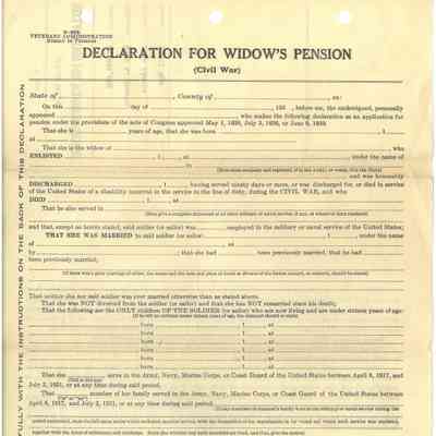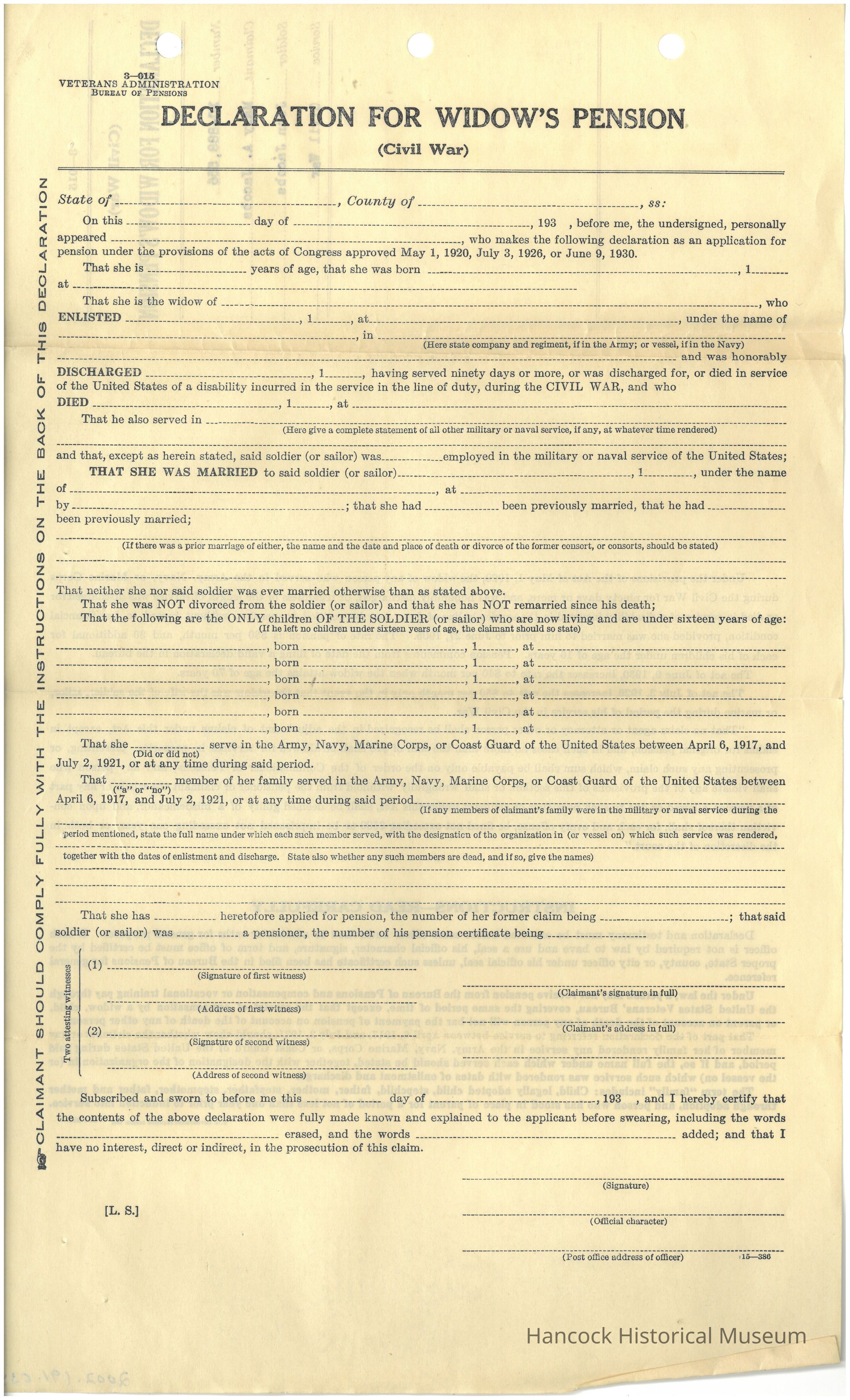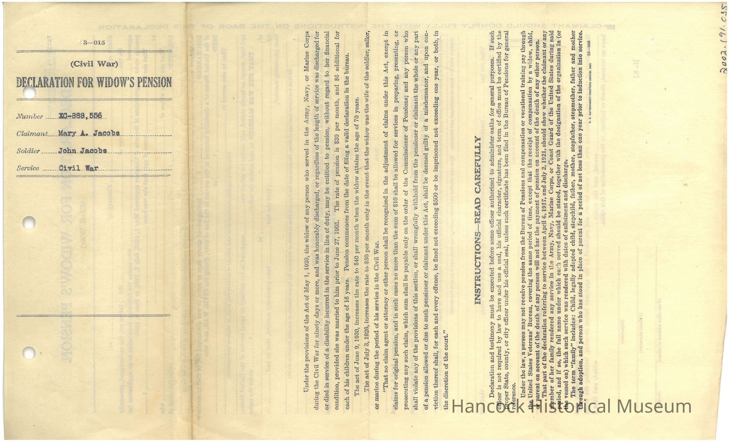 Declaration for Widows pension XC 888556 from Mary A Jacobs, Widow of John Jacobs 128th OVI, not filled out.Collection