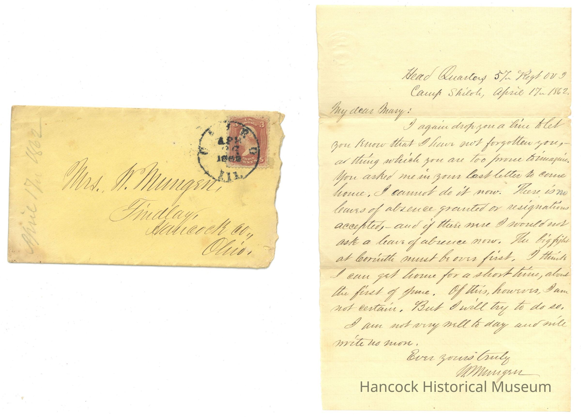 Letter from Colonel William Mungen to his wife Mary during the Civil War