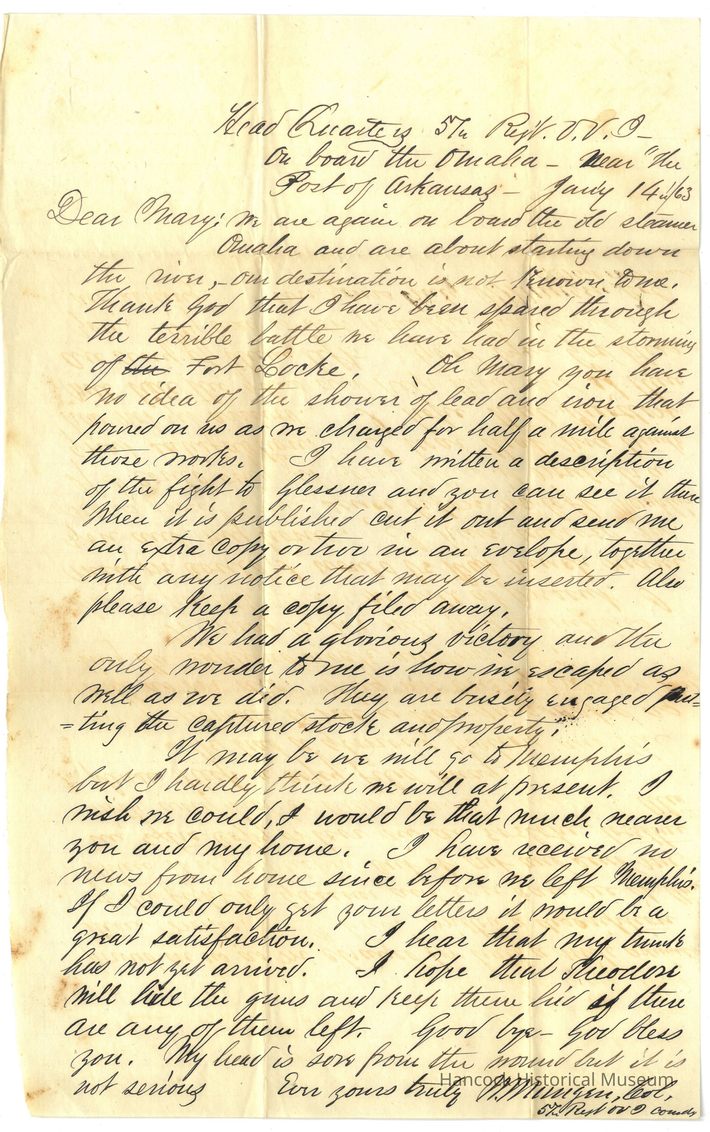 Letter from Colonel William Mungen to his wife Mary during the Civil War