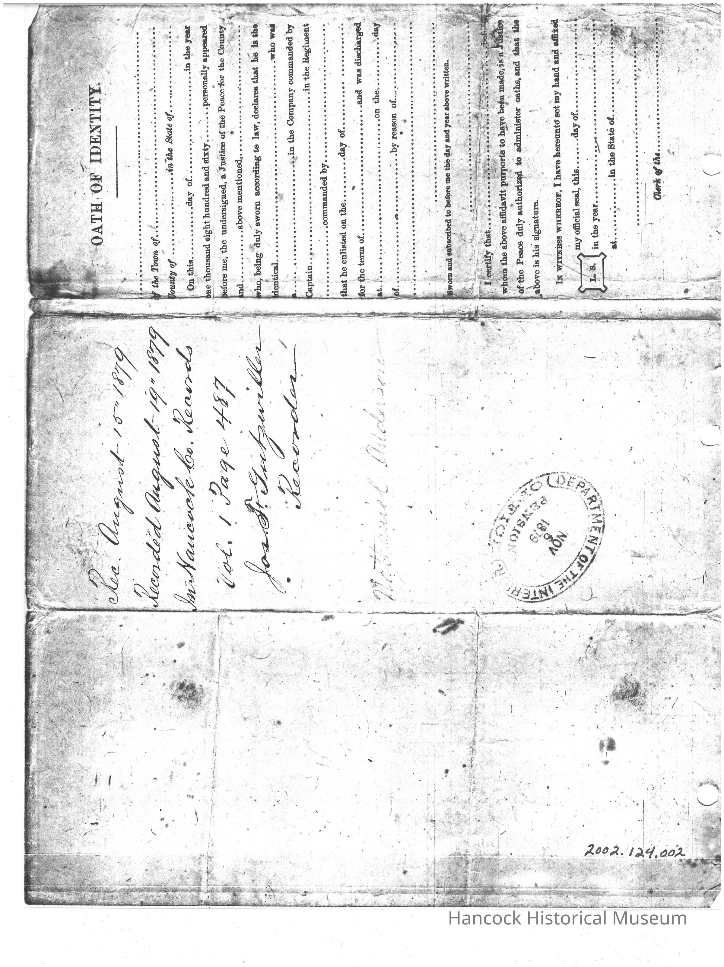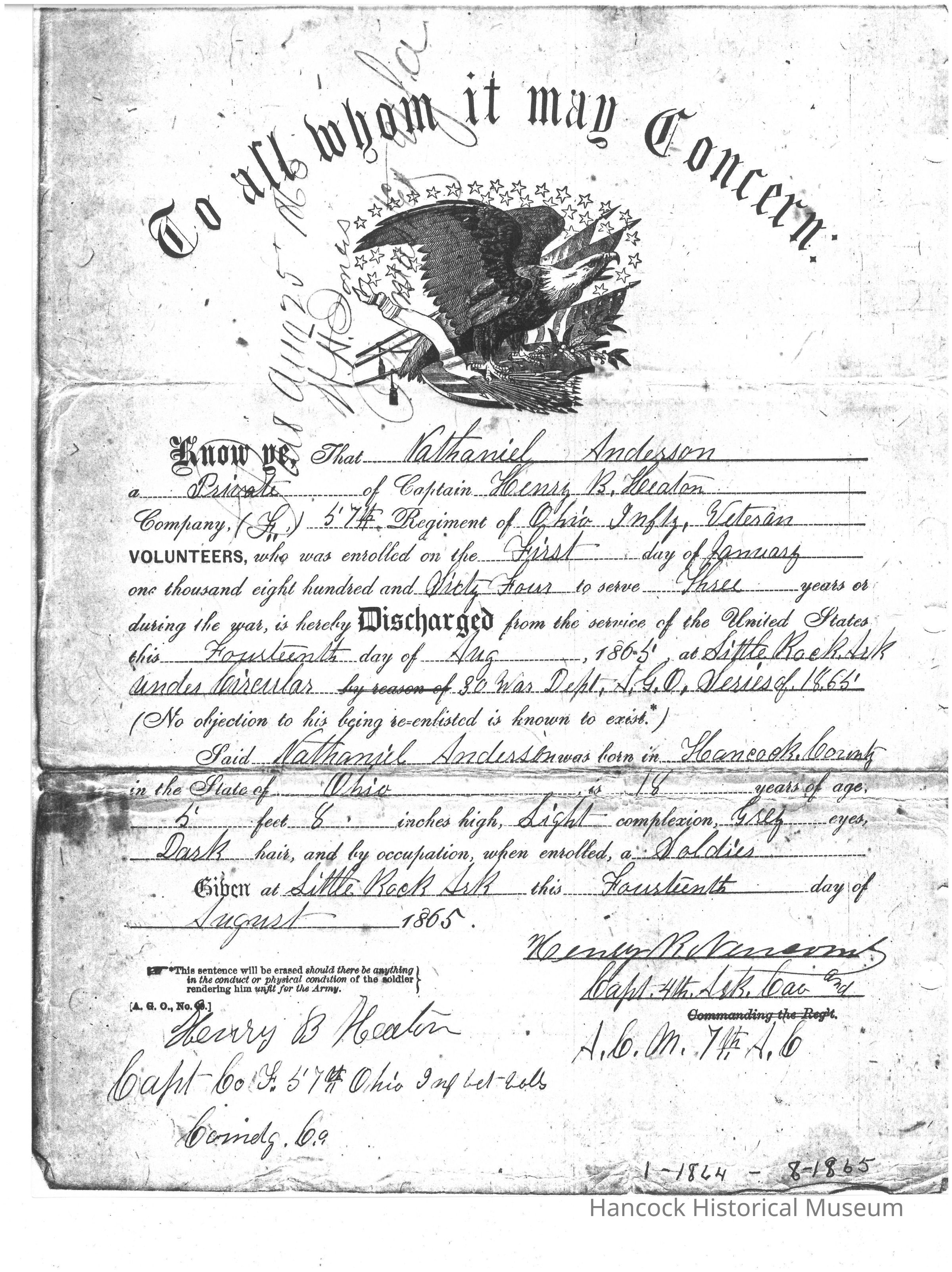 Photo copy of Discharge of Nathaniel Anderson from 57th OVI dated Aug 14, 1865.