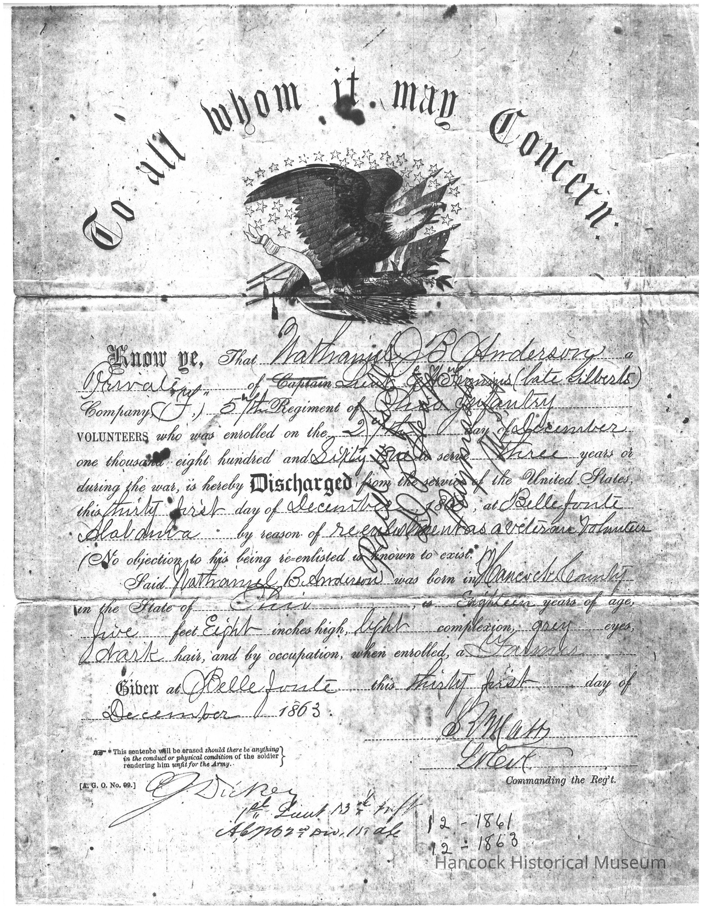 Photocopy of Discharge of Nathaniel J B Anderson from 5th OVI dated Dec 31, 1863.