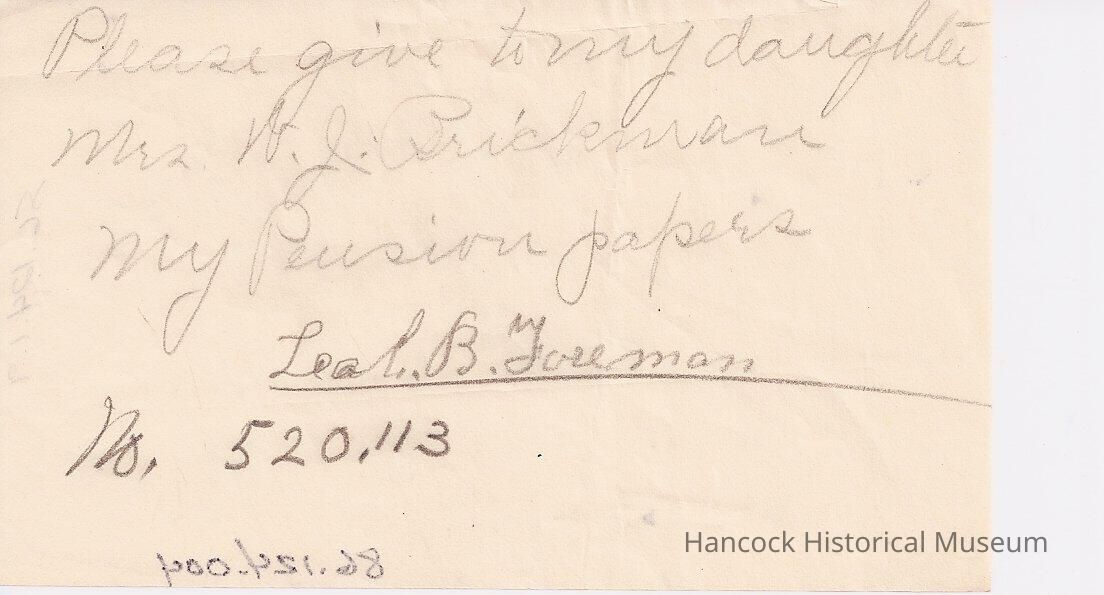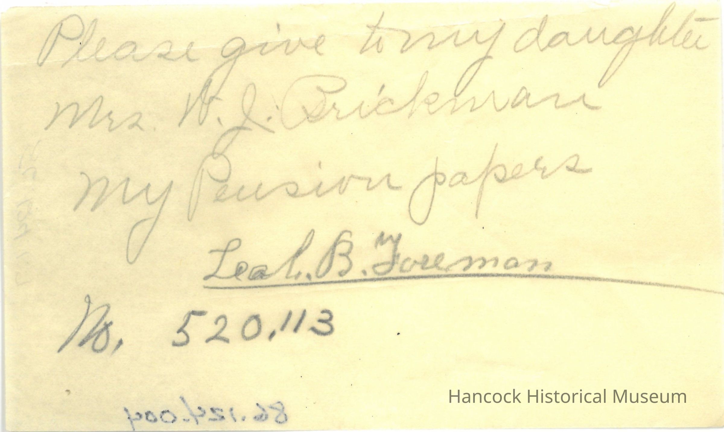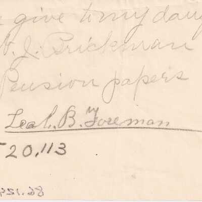 Note hand written by Leah B Foreman concerning disposition of pension paperwork for Certificate #520113.Collection