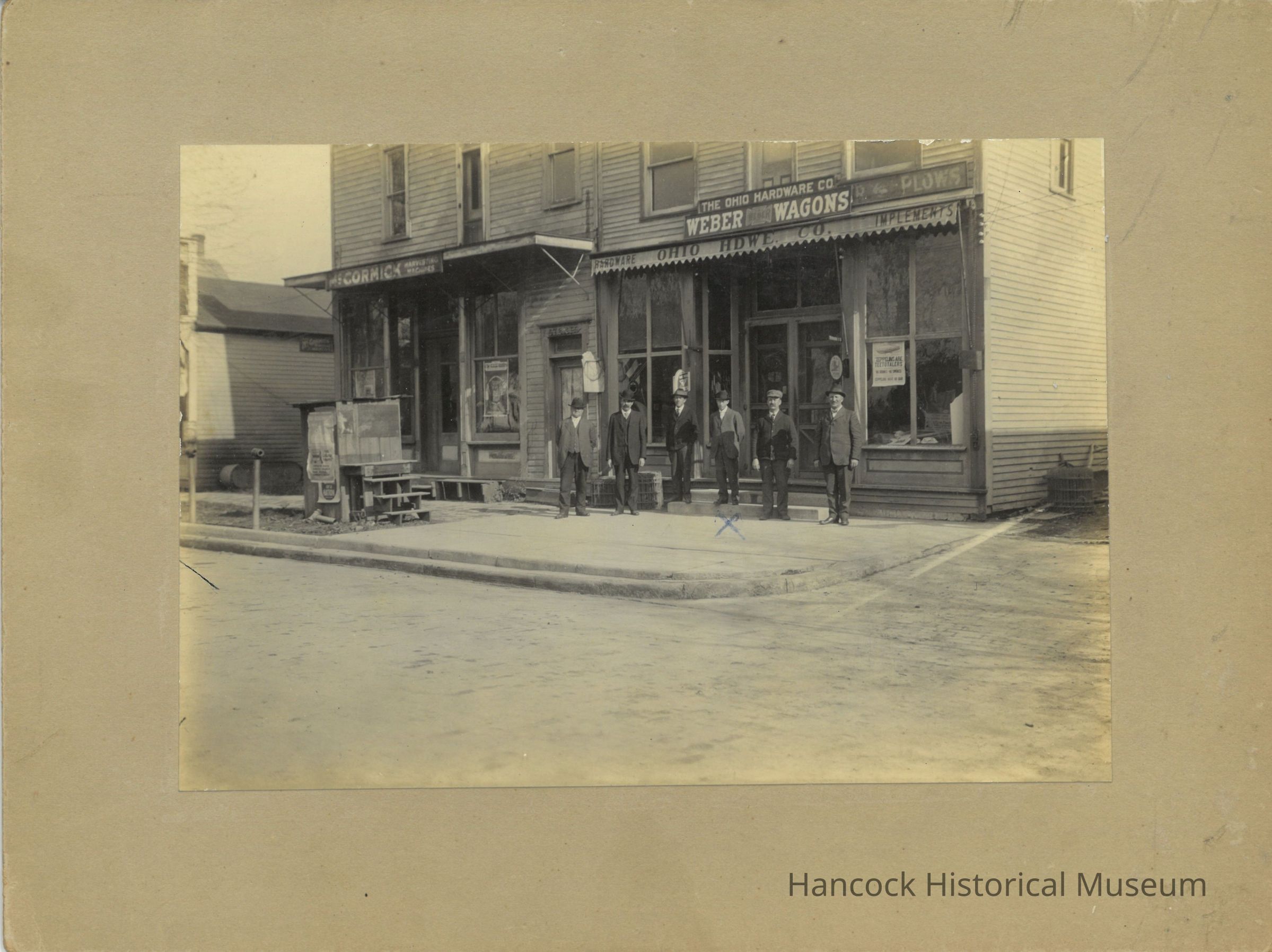 photograph on cardboard of Addison Metzer (middle) and five other men outside the Ohio hardware Company selling Webber Wagons in Arlington, Ohio
