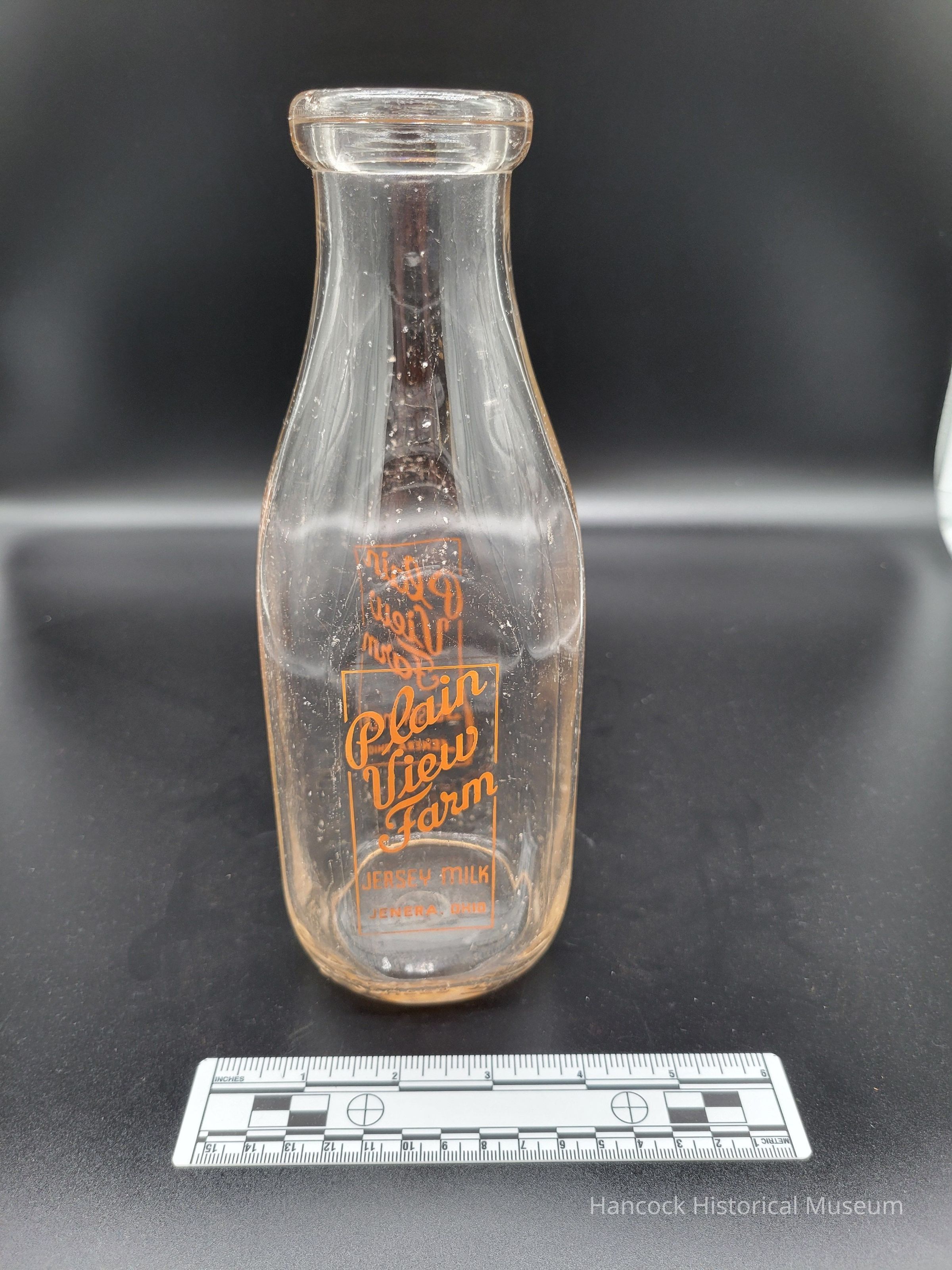 clear glass milk bottle with orange writing "Plain View Farm" Jersey Milk Jenera Ohio
