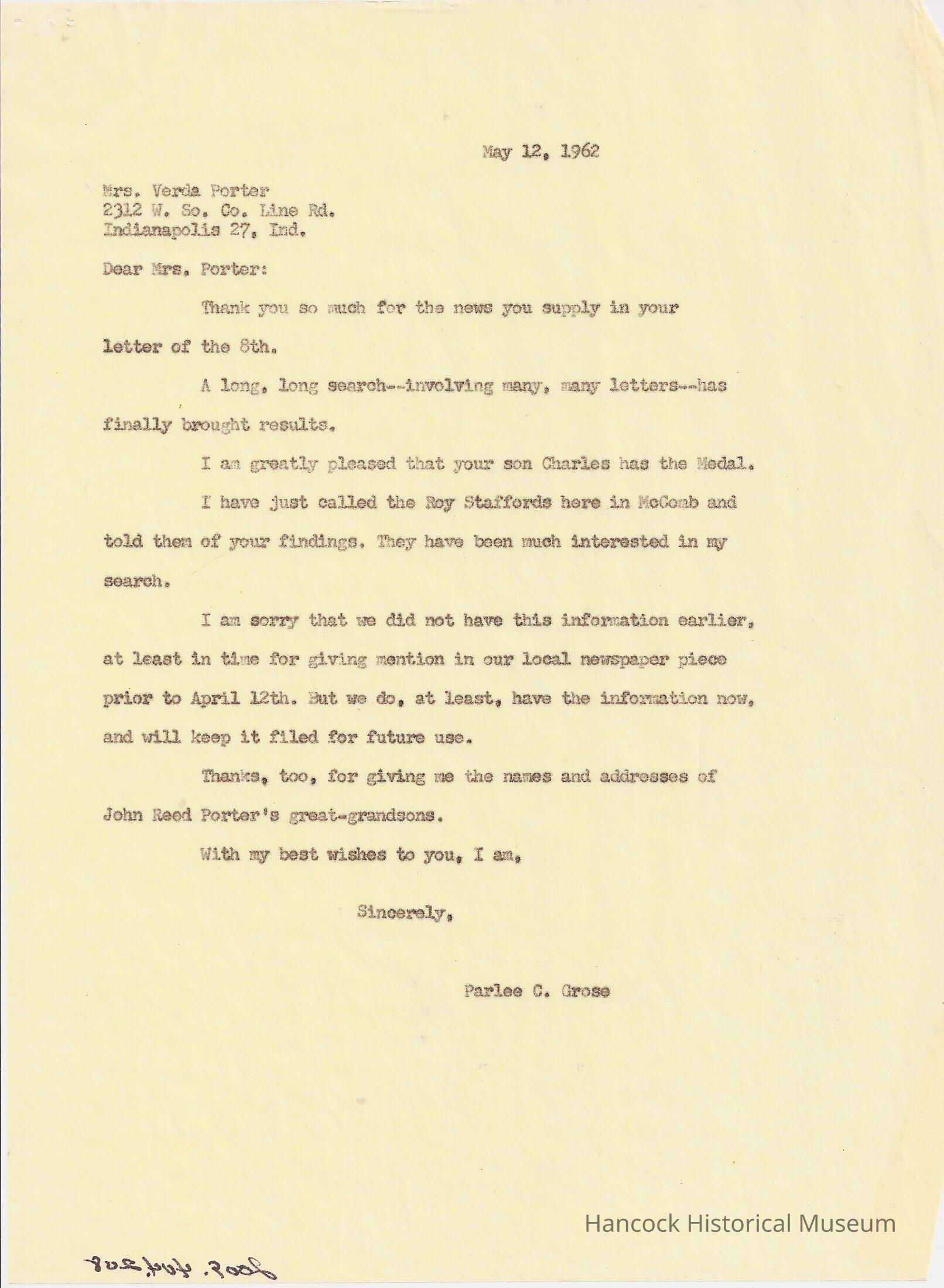 Letter from Parlee C Grose to Verda Porter dated May 12, 1962.