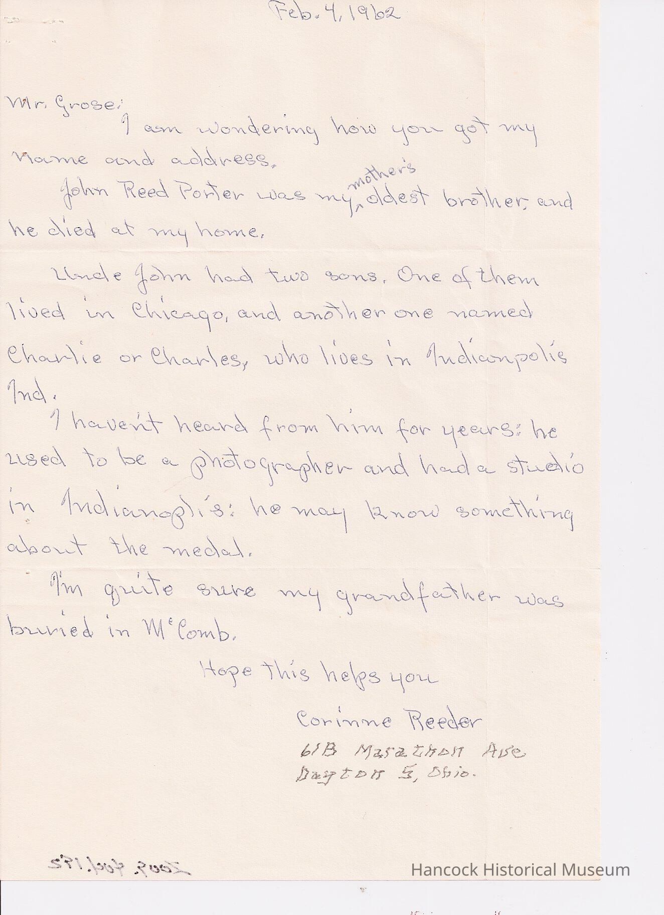 Letter from Corinne Reeder to Parlee C Grose dated Feb 4, 1962.