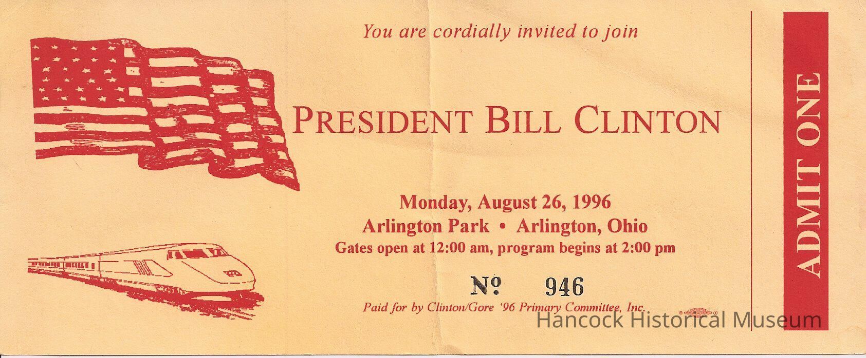 Cardboard ticket to admit one to president Bill Clinton speech at Arlington, Oh on Aug 26, 1996.Collection