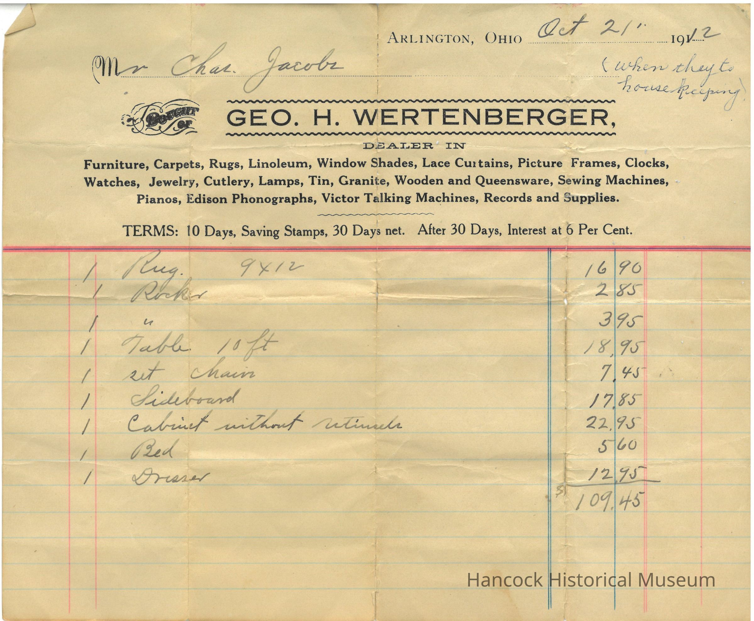 Bill from George H. Wertenberger, dealer in Furniture, Carpets, Rugs, Linoleum, Window Shades, Lace Curtains, Picture Frames, Clocks, Watches, Jewelry, Cutlery, Lamps, Tin, Granite, Wooden and Queensware, Sewing Machines, Pianos, Edison Phonographs, Victor Talking Machines, Records and Supplies. in Arlington, Ohio. Made out to Mr. Charles Jacobs on October 21, 1912Lexicon