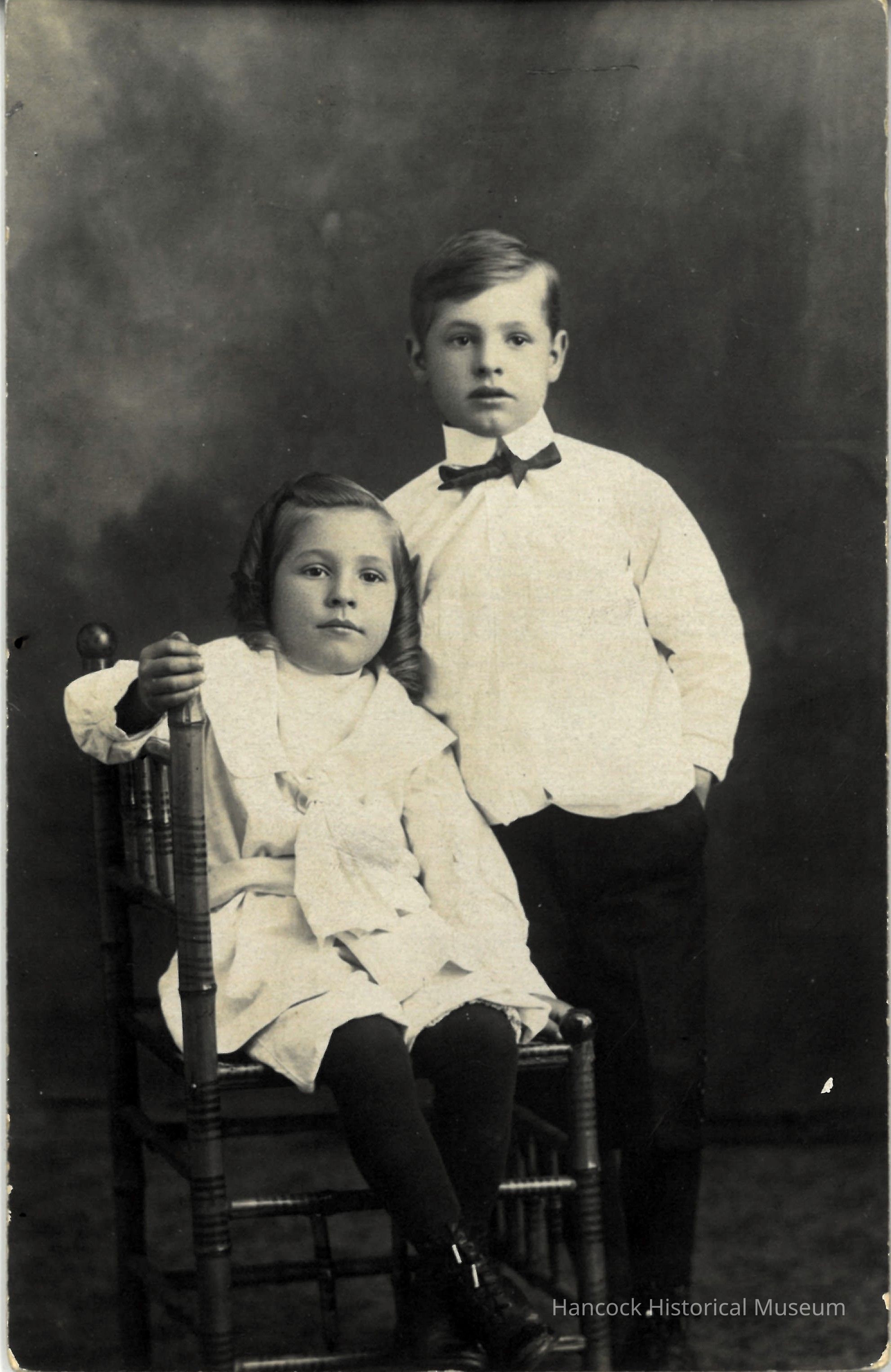 This vintage black-and-white photograph captures two young children posed against a dark, textured studio backdrop that enhances the image's classic aesthetic; the girl, seated on an intricately designed wooden chair, wears a white dress with a large bow and dark leggings, while the boy stands beside her, dressed in a white shirt with a bow tie and dark trousers, his hands casually placed in his pockets, both gazing into the camera.