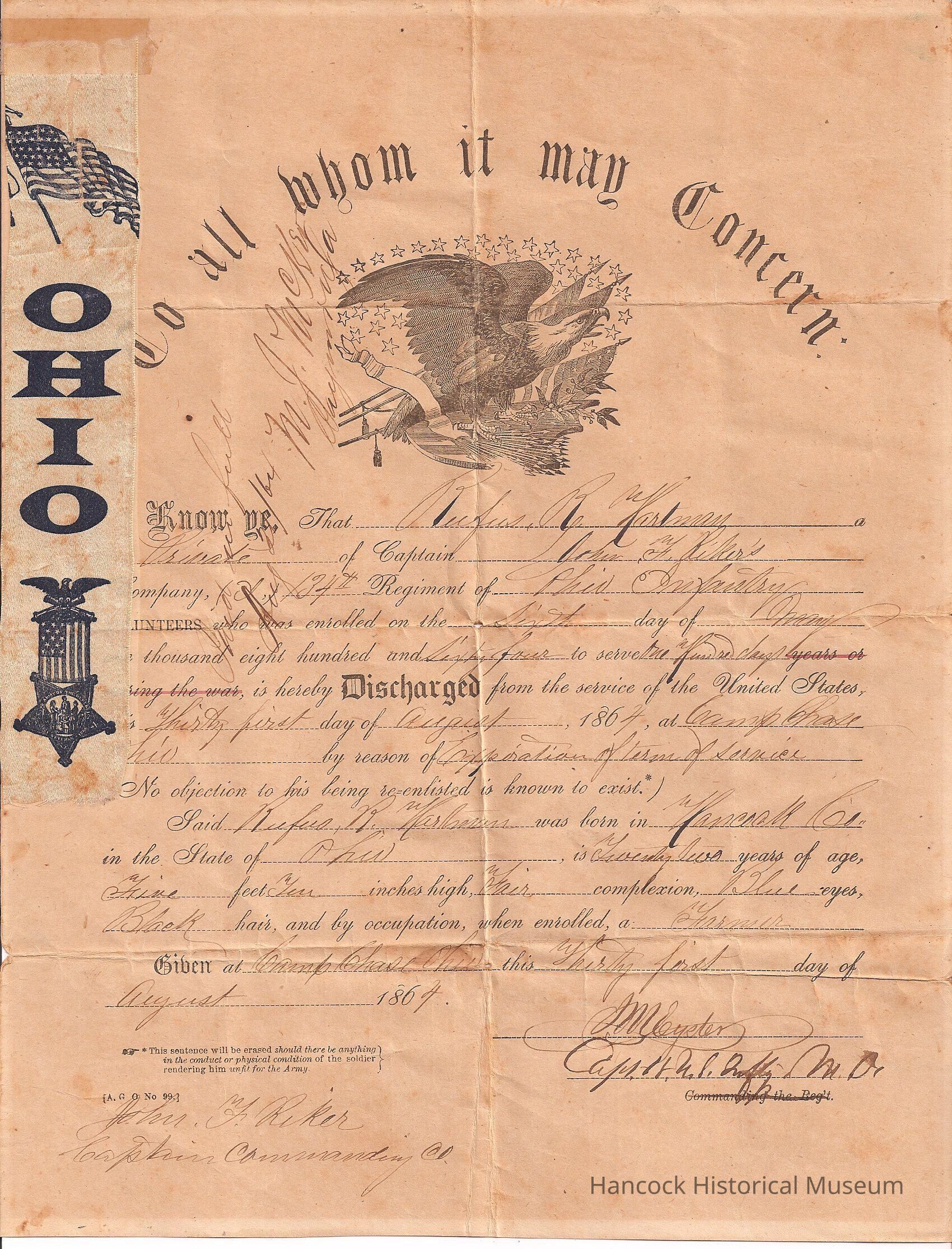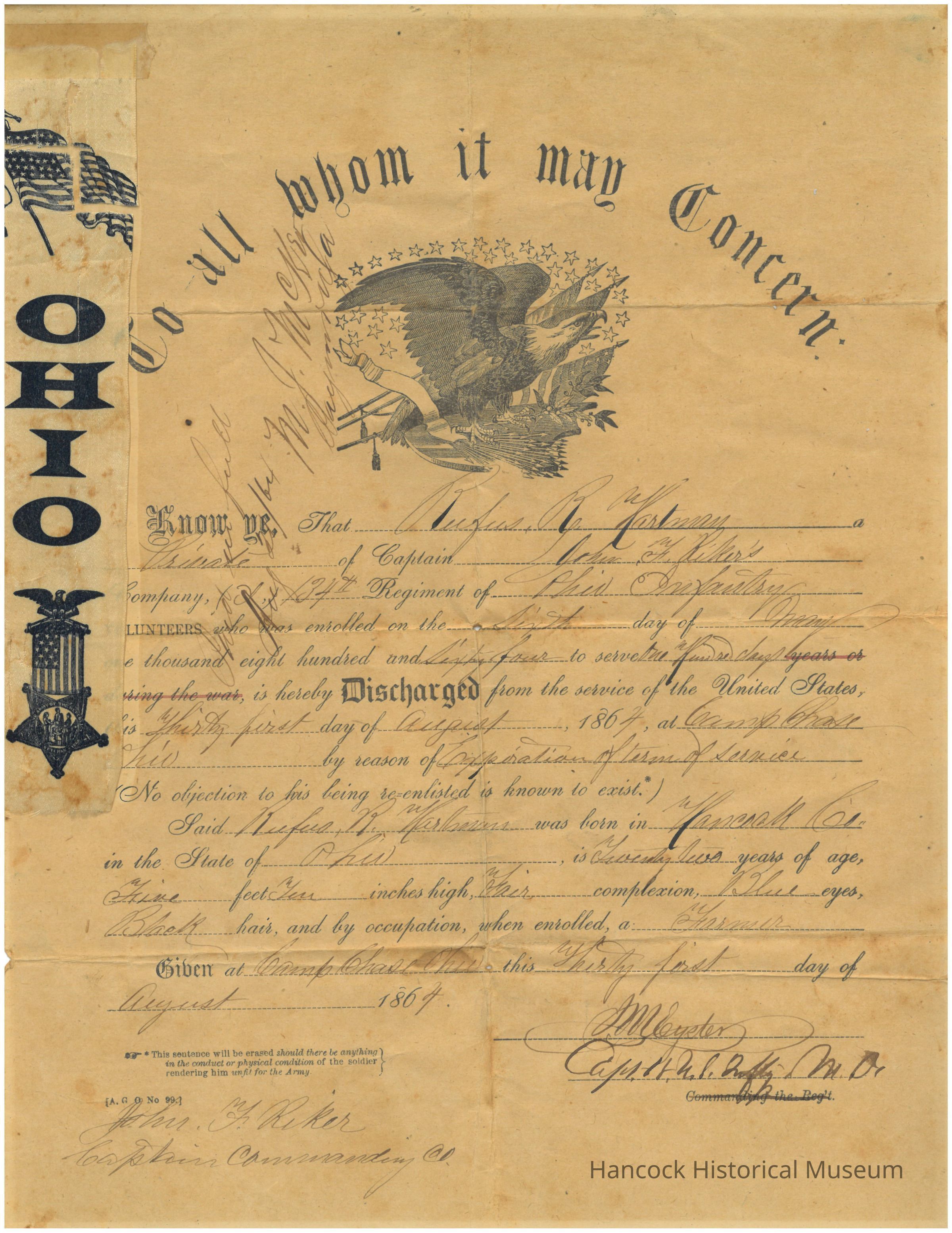 Discharge from 134th OVI of Rufus R Hartman dated Aug 31, 1864.