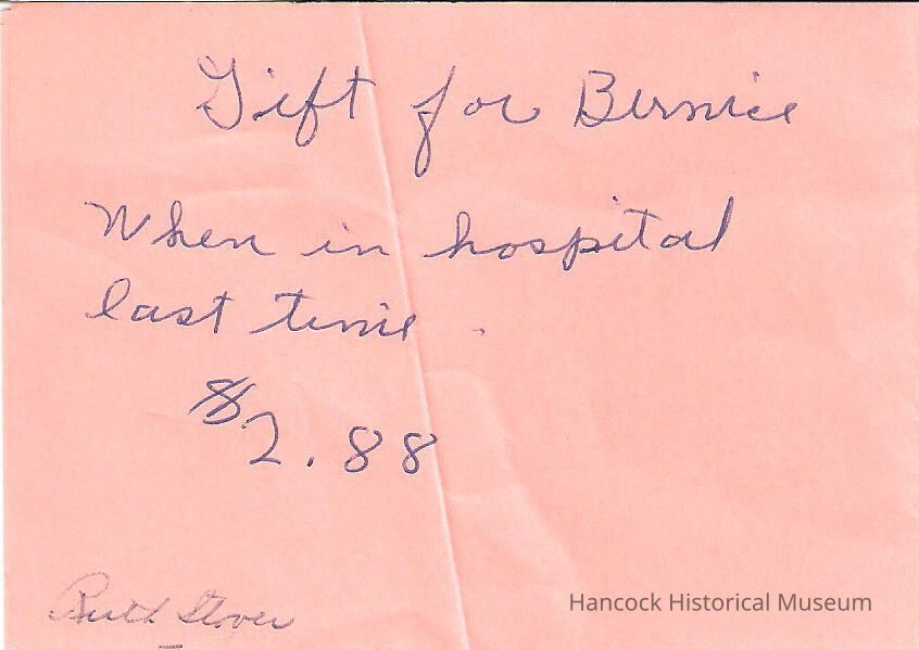Hand written receipt for gift for Bernice when in hospital at time signed ruth stoner undated.Collection