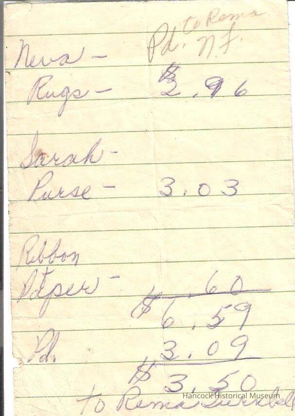 Hand written receipt for purchases for members of Stitch & Chatter Club gifts signed by Rema Turnbell undated.Collection