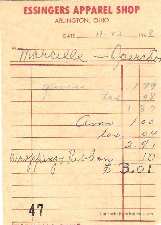 Receipt from Essinger Apparel Shop, Arlington, Oh to Stitch & chatter Club of Arlington, Oh Nov 12, 1968.Collection
