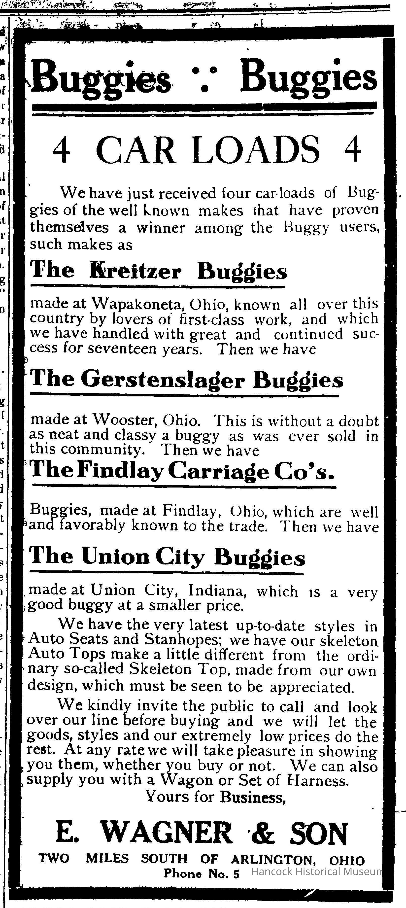 Emanuel Wagner and his son Archie ran a buggy dealership on their farm halfway between Arlington and Williamstown on what is now State Route 68. The dealership known as E. Wagner & Son was started at least by 1900, where Archie is listed in that year’s census with the occupation “dealer in carriages.” Advertisements for the business appeared in The Arlingtonian, The Findlay Daily Courier, The Findlay Republican, and the Weekly Jeffersonian, between 1899 and 1916. Emanuel Wagner passed away in 1916, and Archie carried on the business until 1920, when he retired and moved to Findlay.Collection