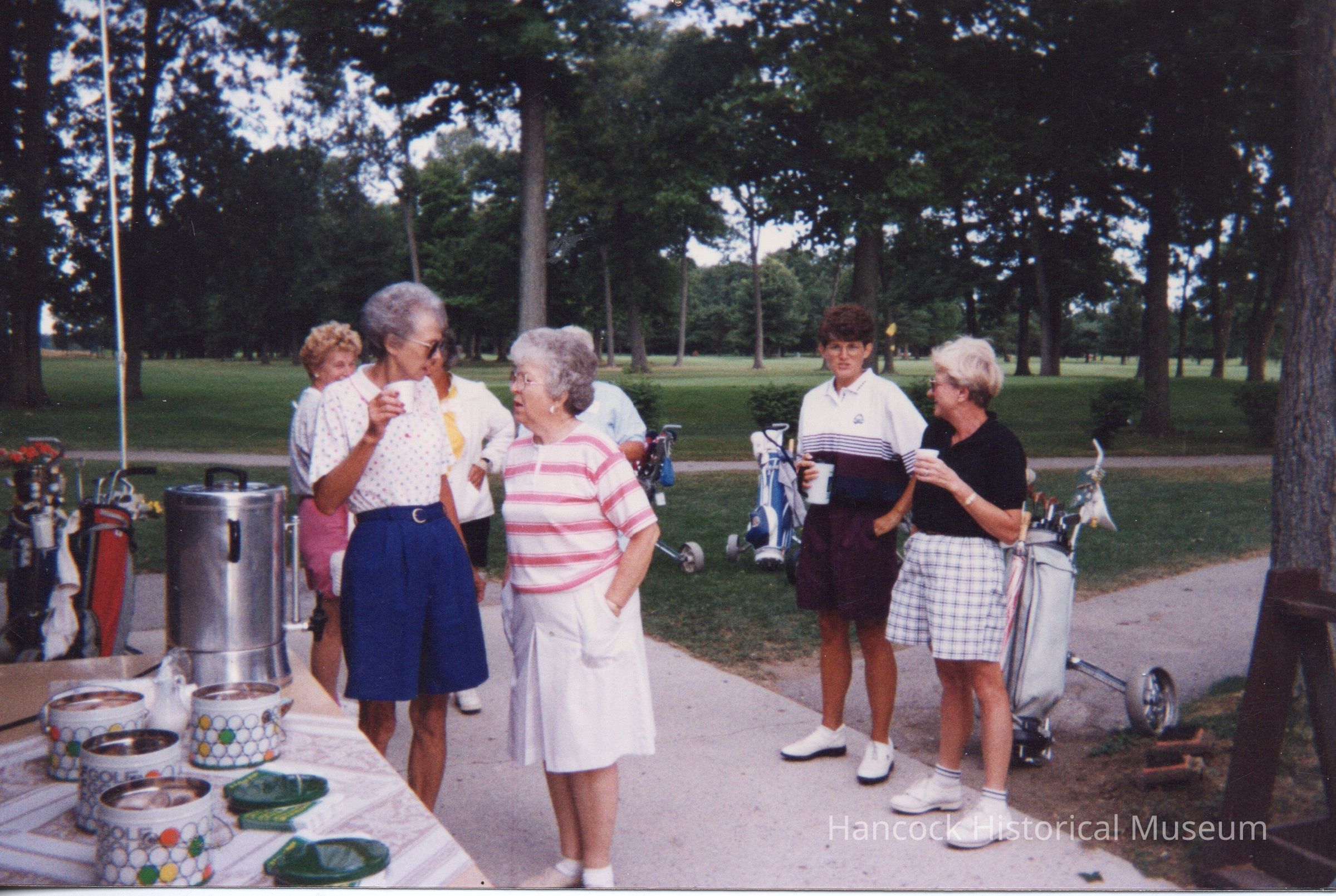 Photo of Ladies eating outside at Sycamore Springs Golf Course Standing on patio with golf clubs in background