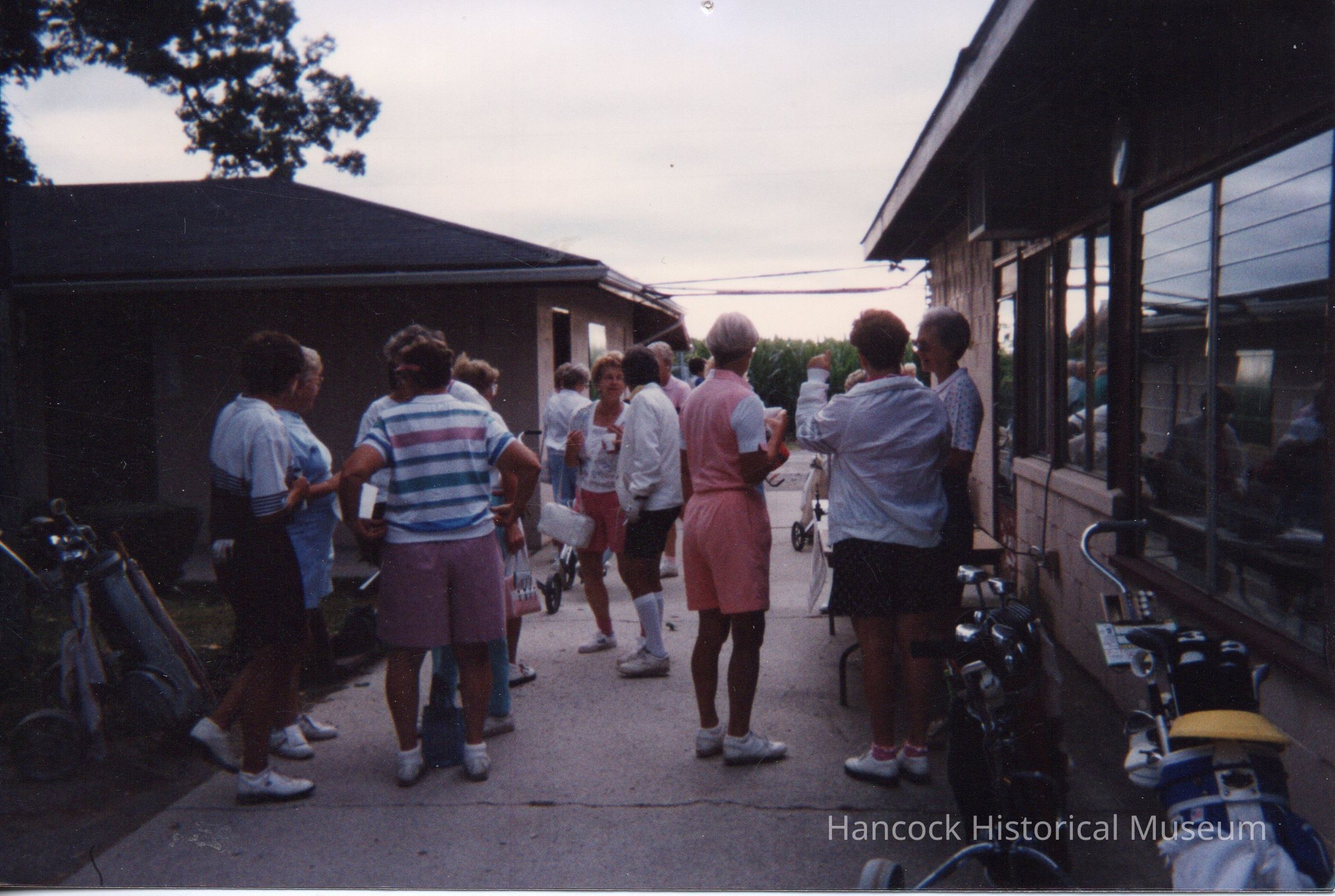 Photo of Ladies eating outside at Sycamore Springs Golf Course Standing on patio with golf clubs in Foreground