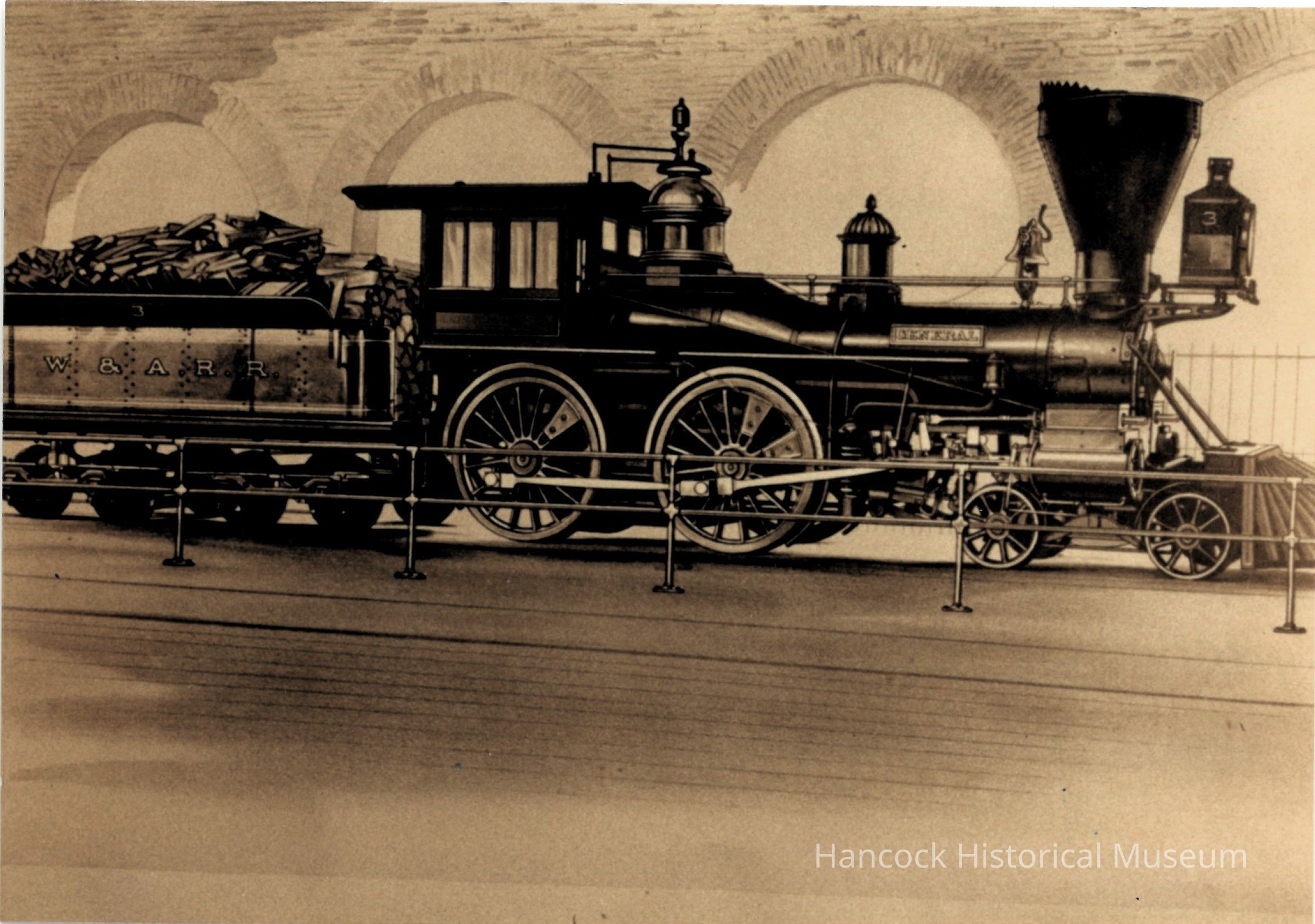 4 x 5 b/w photo of a painting of the General locomotive from Andrews Raiders c 1966