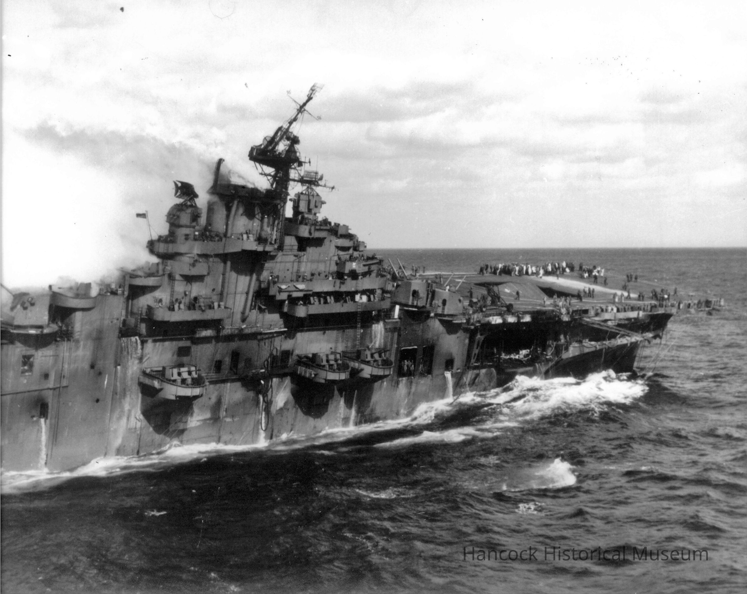 8 x 10 b/w photo of USS Franklin's starboard side aft of island to bow as seen from the USS Santa Fe (CL-60) after Japanese aircraft attack on Mar 19, 1945.