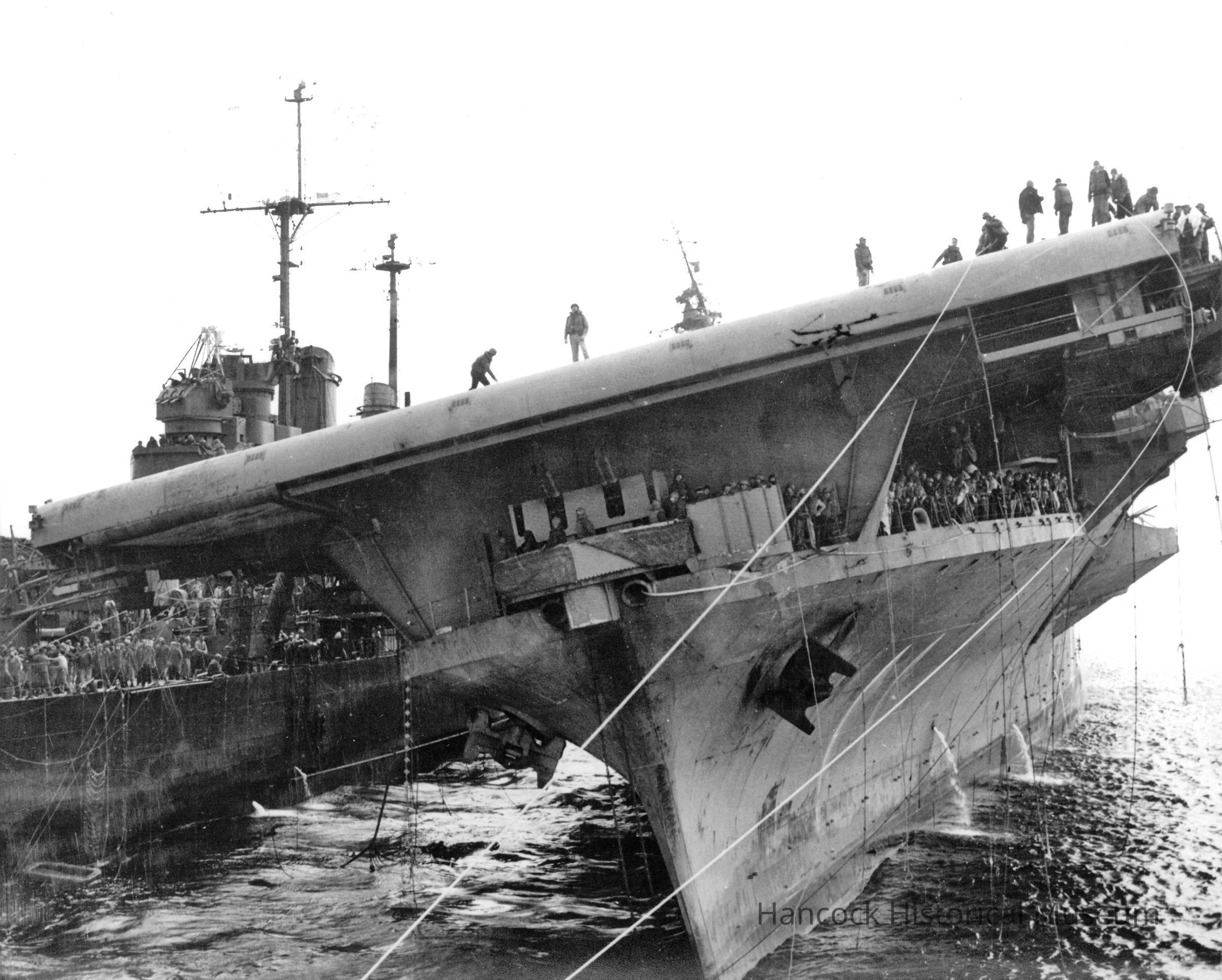 8 x 10 b/w photo of USS Franklin at 13 degrees starboard list, lines being passed to the USS Pittsburgh (CA-72) in preparation for towing after Japanese aircraft attack on Mar 19, 1945.