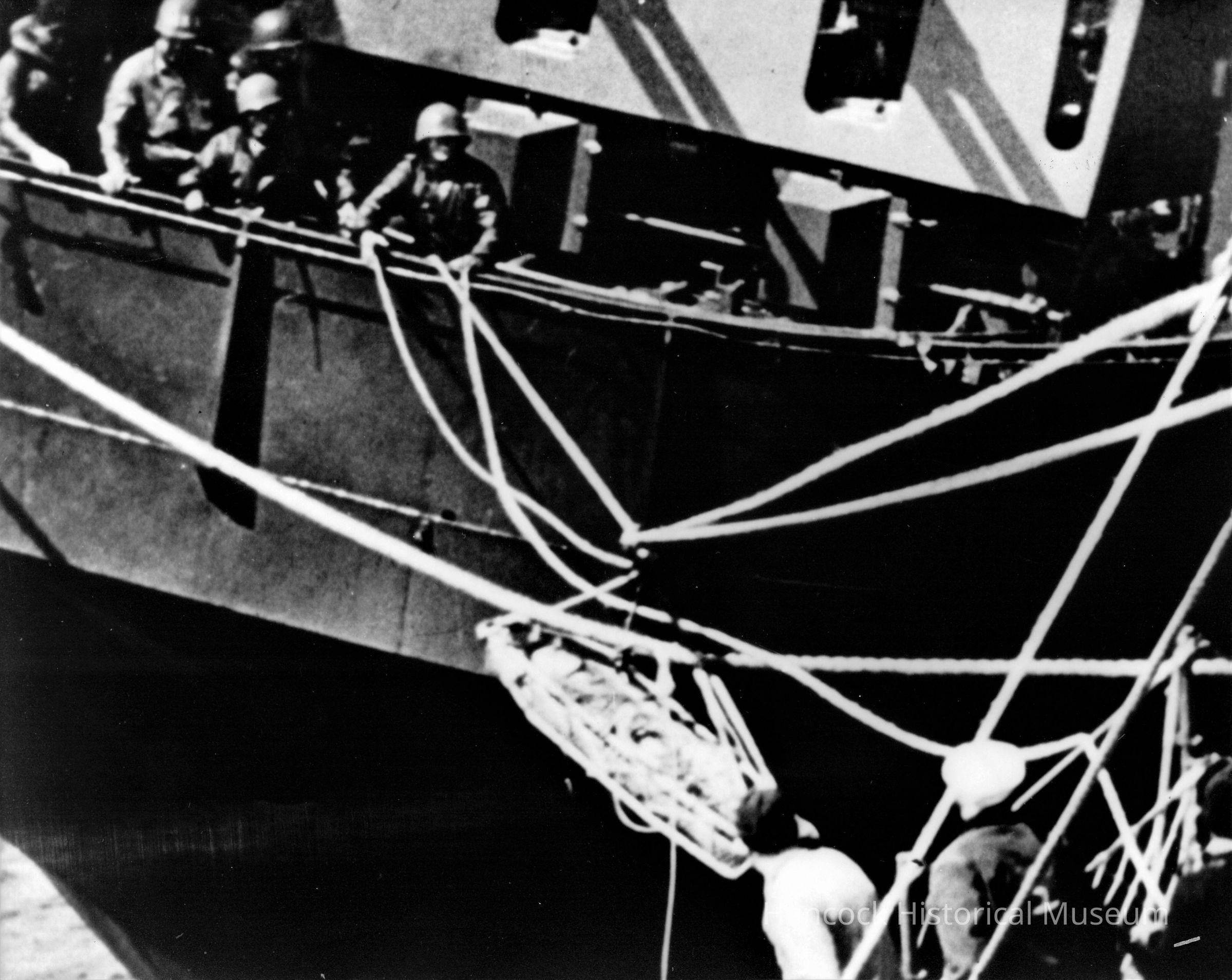 8 x 10 b/w photo of transferring injured to USS Hickox (DD-673) from USS Franklin after Japanese aircraft attacked on Mar 19, 1945.