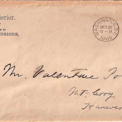 Envelope to Valentine Powell, Mt Cory, Oh from Bureau of Pensions Postmarked Oct 20, 1909.Collection