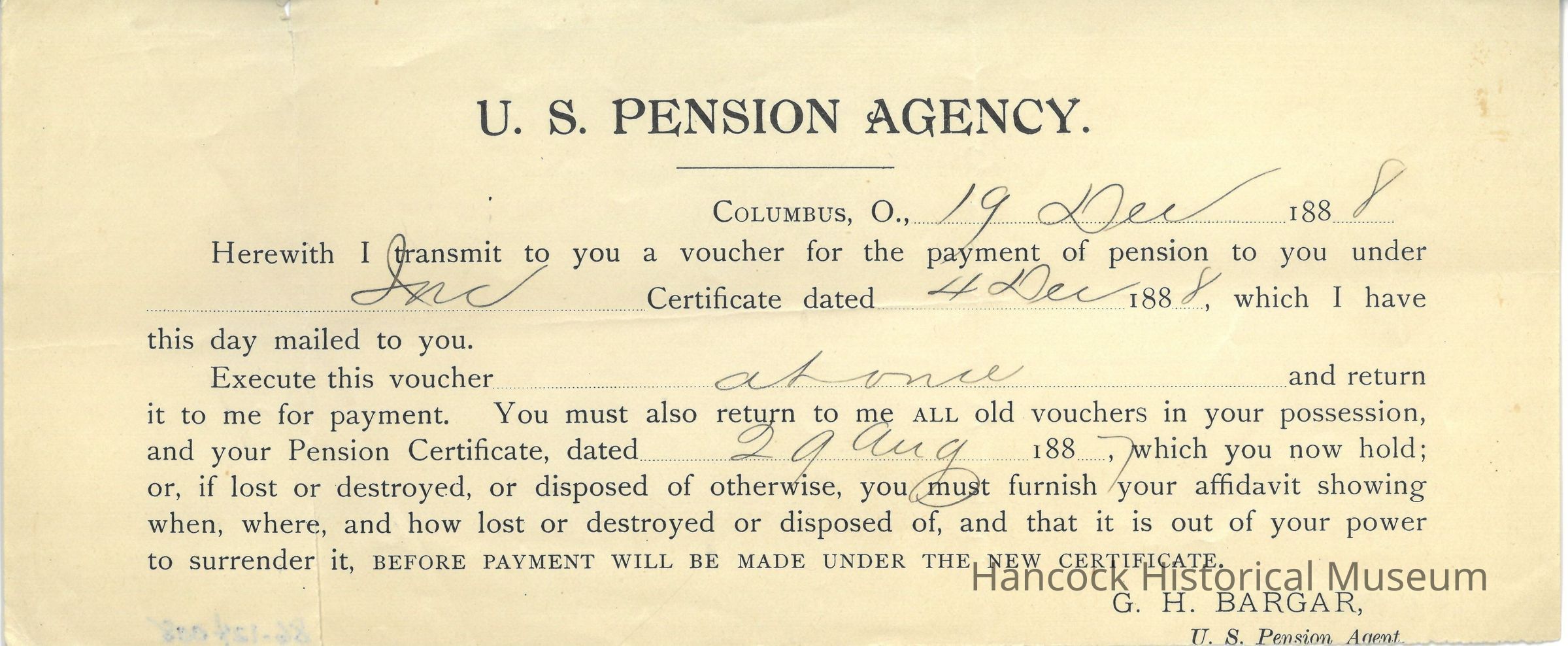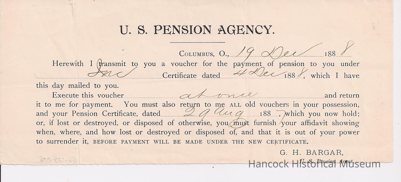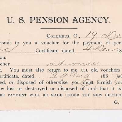 Voucher from Bureau of pensions to Daniel Foreman dated Dec 19, 1888.Collection