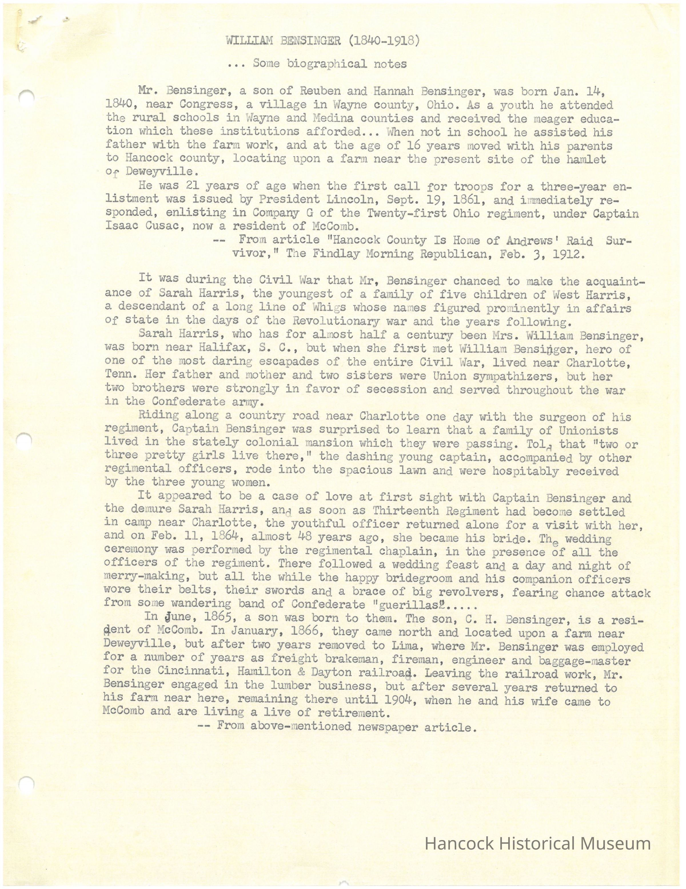 William Bensinger Civil War Biographic InfoEntry/Object ID