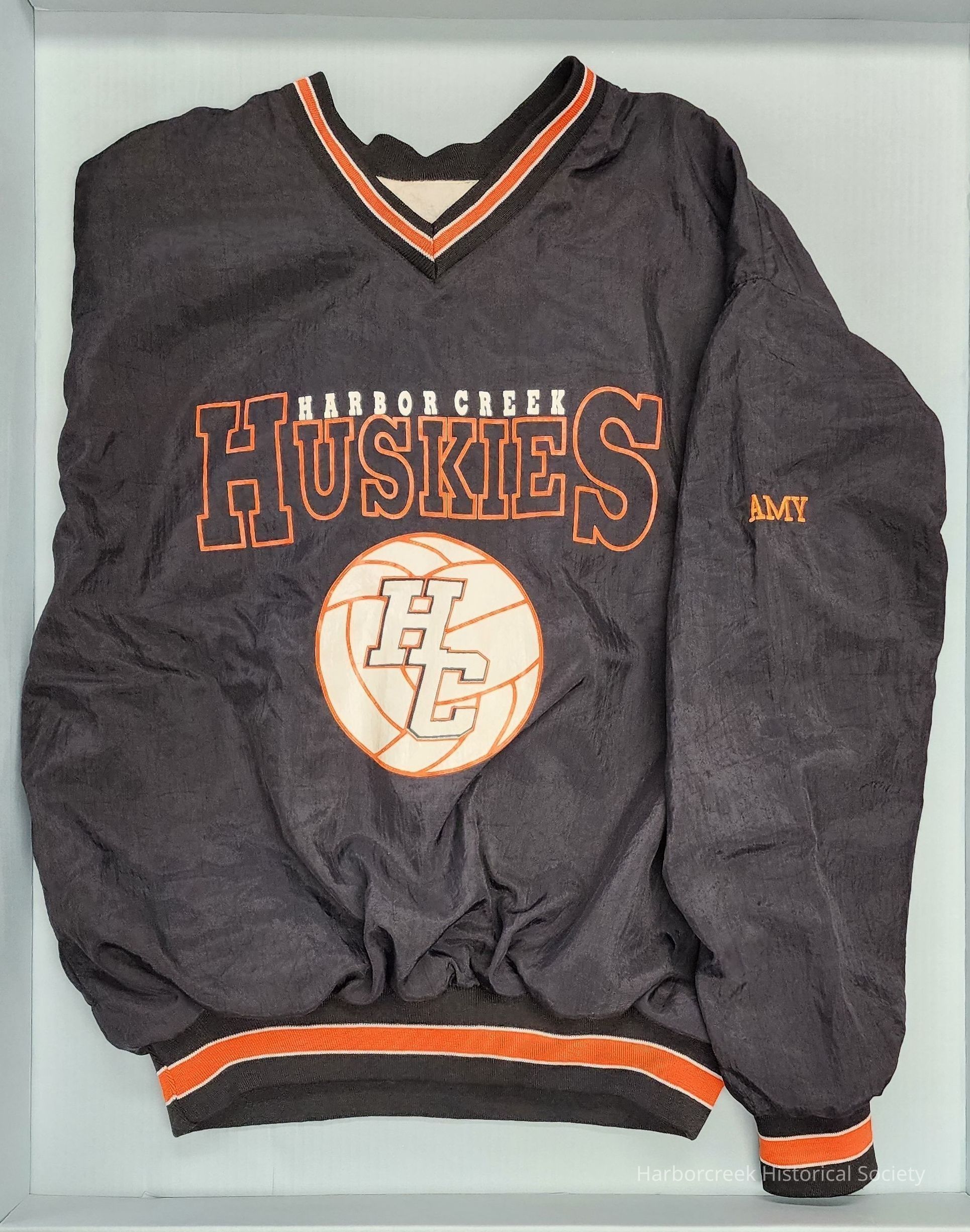 Black v-neck, long-sleeved pullover jacket with "Harbor Creek Huskies" and "HC" within a graphic of a volleyball on the front, and "Amy" embroidered on the left sleeve. V-neck, waist, and sleeve ends have elastic bands with orange, white, and black striping. Manufactured by Holloway.Context