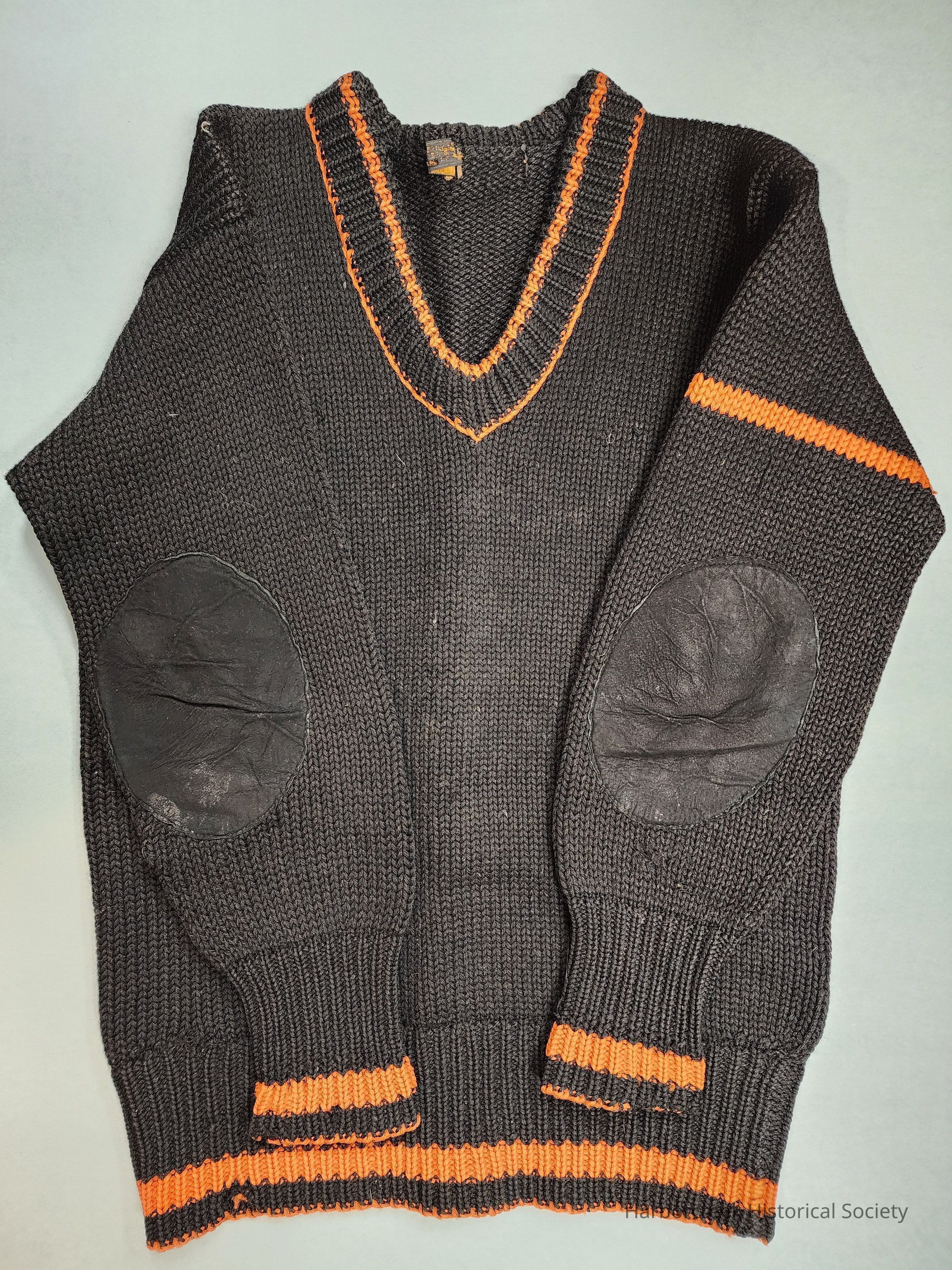 Harbor Creek High School black knit sweater with orange striping at collar, hem, and sleeves and protective elbow patches.