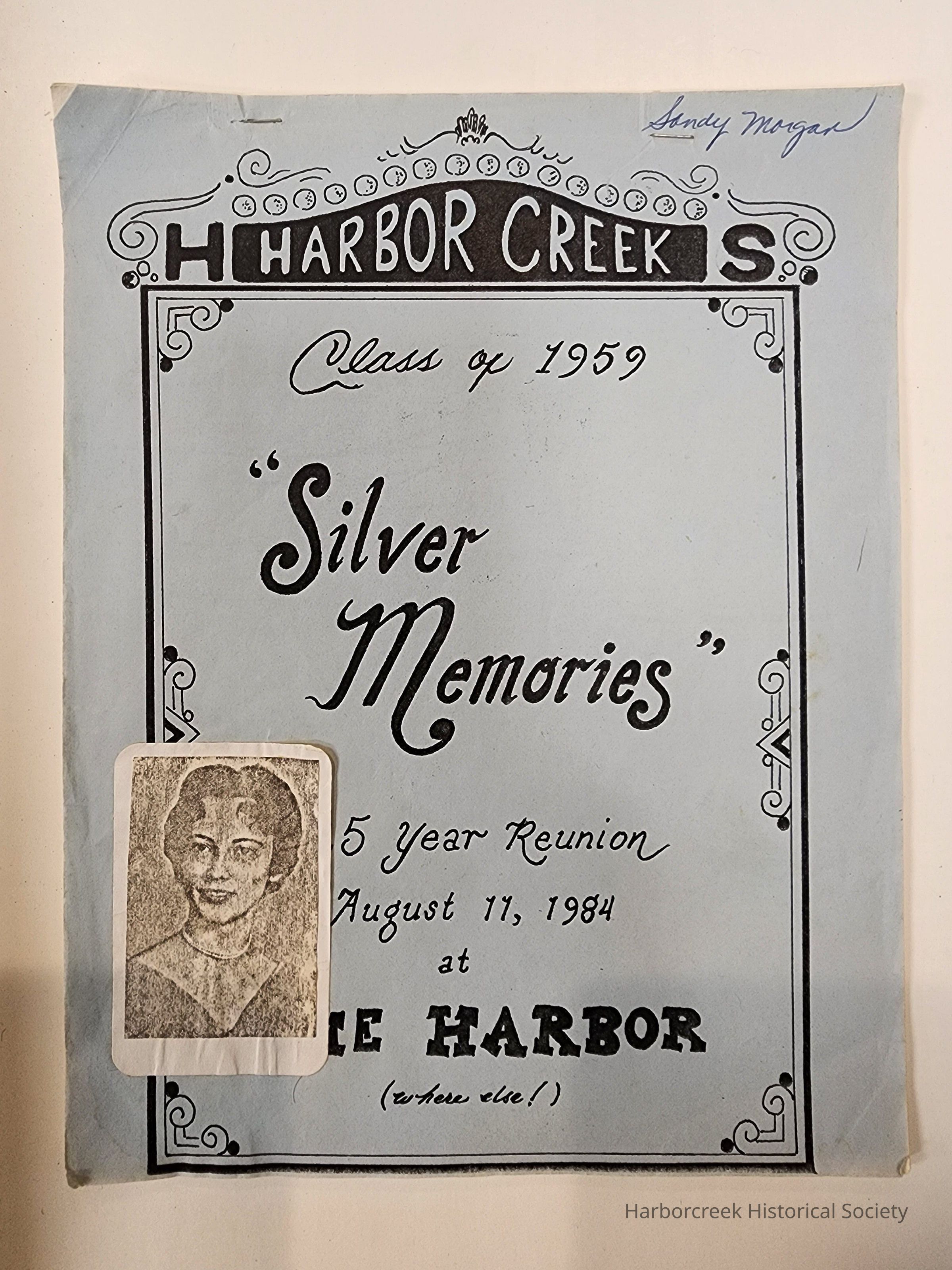 Cover page reads, "Harbor Creek High School Class of 1959 "Silver Memories" 25 Year Reunion, August 11, 1984 at The Harbor (where else!)." Booklet contains short biographies for many of those in the Class of 1959. Handed out at the 25th class reunion. Sandy Morgan's copy.Collection