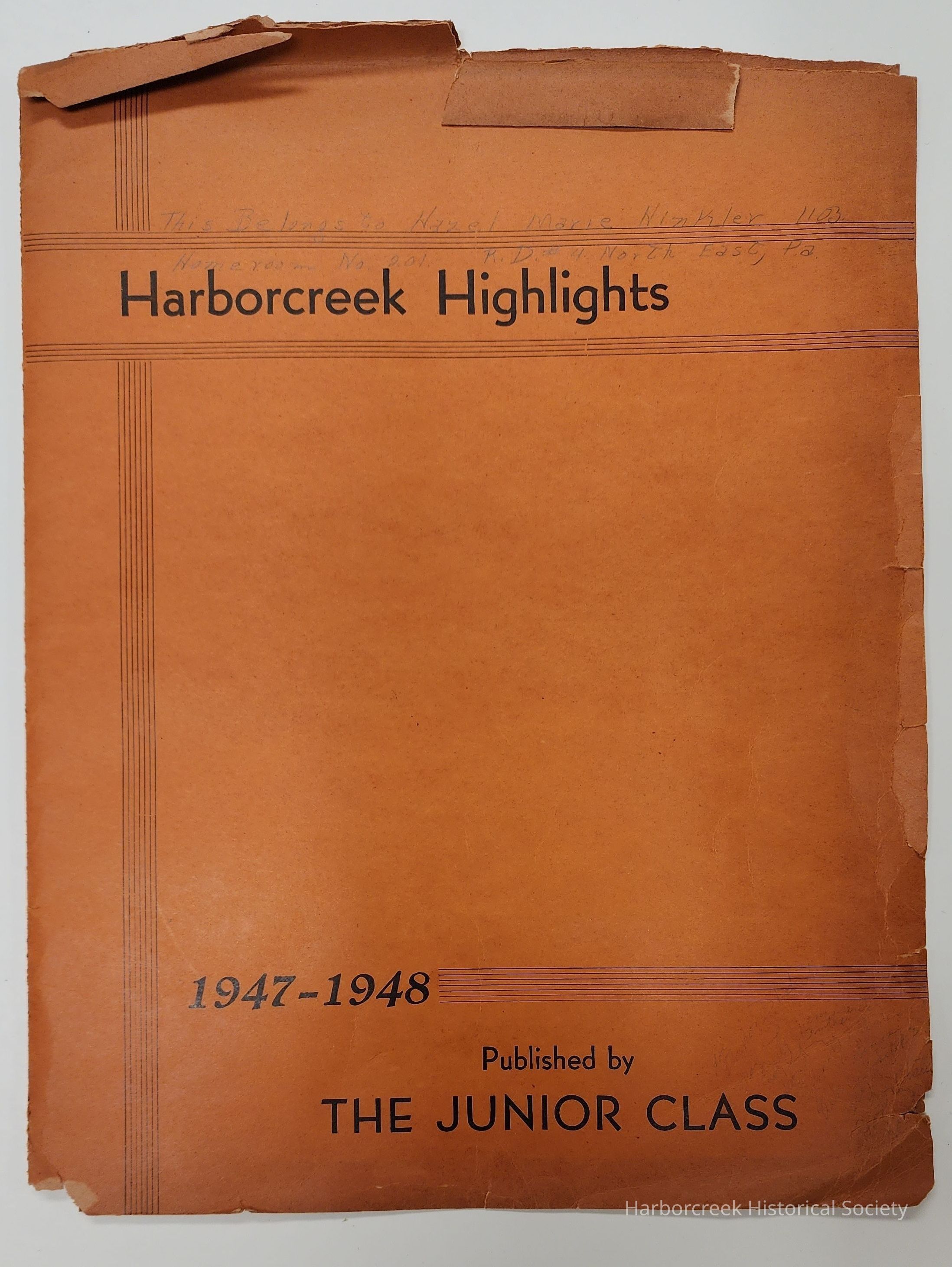 A collection of (5) issues of the Harborcreek Highlights monthly newsletter published by the Harbor Creek Jr./Sr. High School, plus a folder titled, "Harborcreek Highlights, 1947-1948, Published by the Junior Class." Handwritten note on folder reads, "This belongs to Hazel Marie Hinkler, Homeroom No. 201, R.D. #4 North East, Pa."