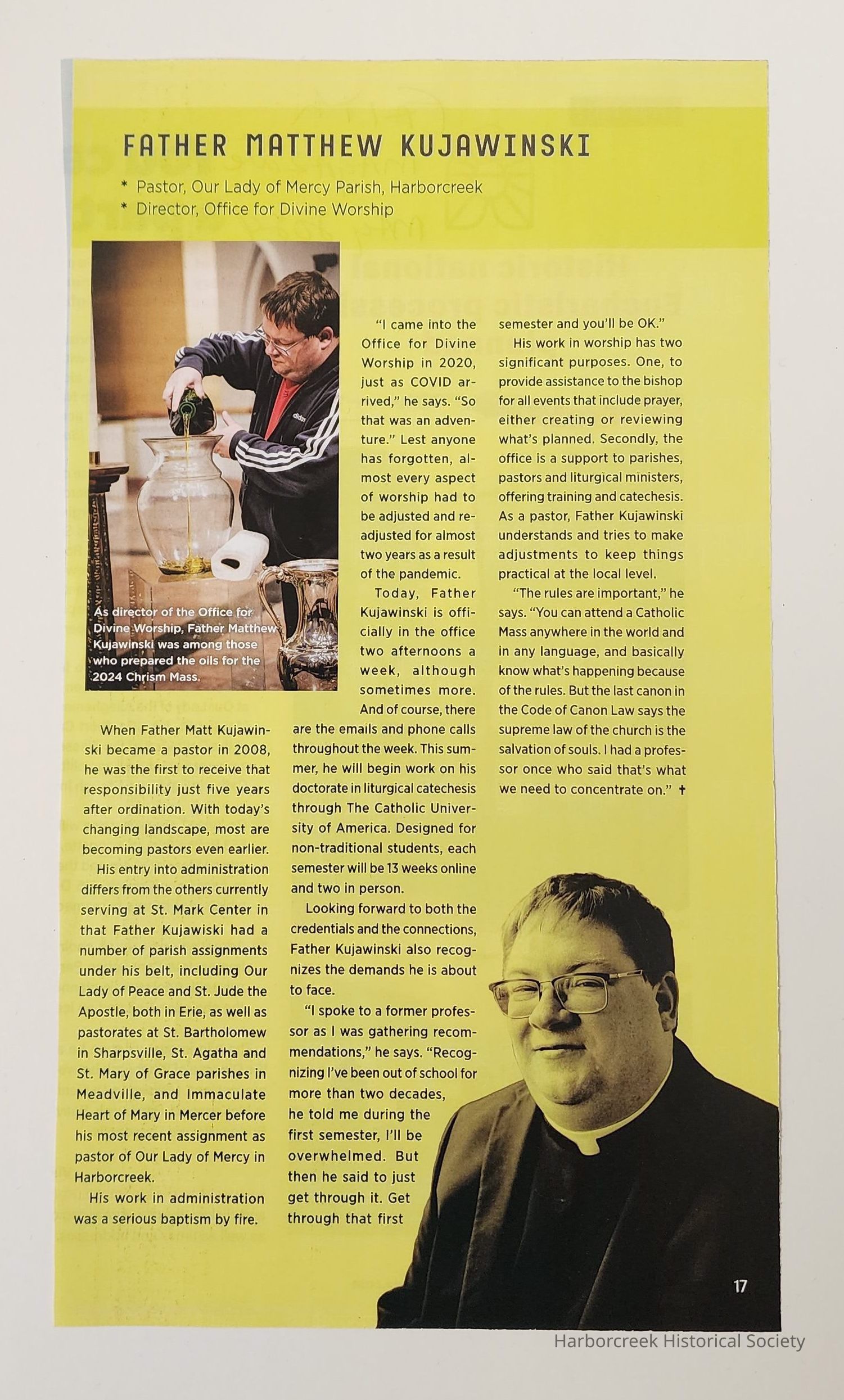 Article clipping, "Father Matthew Kujawinski, Pastor, Our Lady of Mercy Parish, Harborcreek."Context
