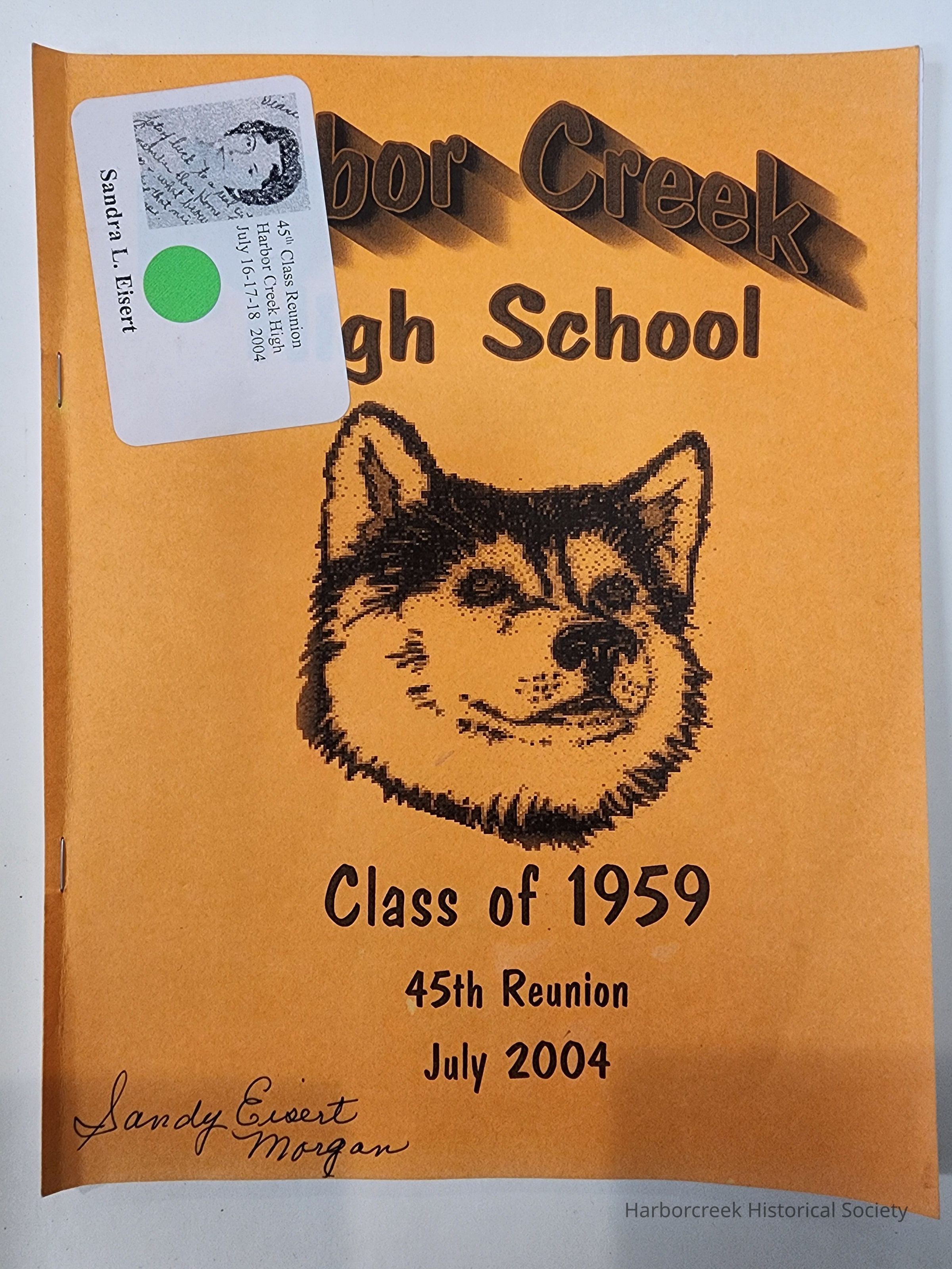 Booklet cover reads, "Harbor Creek High School Class of 1959 45th Reunion July 2004." Content includes alma mater, teachers planning to attend, memorials, and classmate biographies. Handed out at the Class of 1959's 45th reunion. Sandy Eisert Morgan's copy.Collection