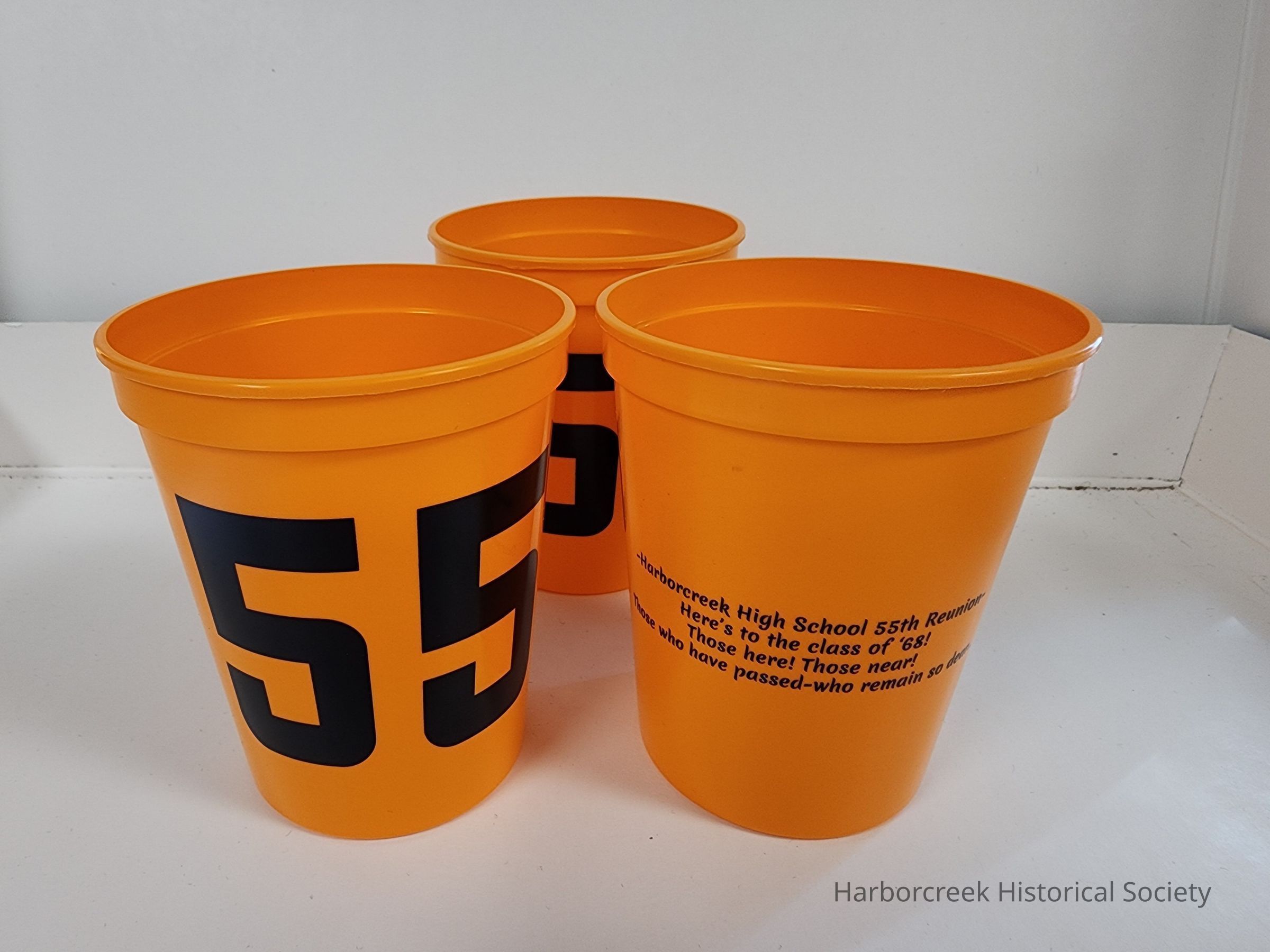 Distributed at the Class of 1968 55th reunion. The following message is printed on one side of the cup, "Harborcreek High School 55th Reunion - Here's to the class of '68! - Those here! Those near! - Those who have passed who remain so dear."Collection