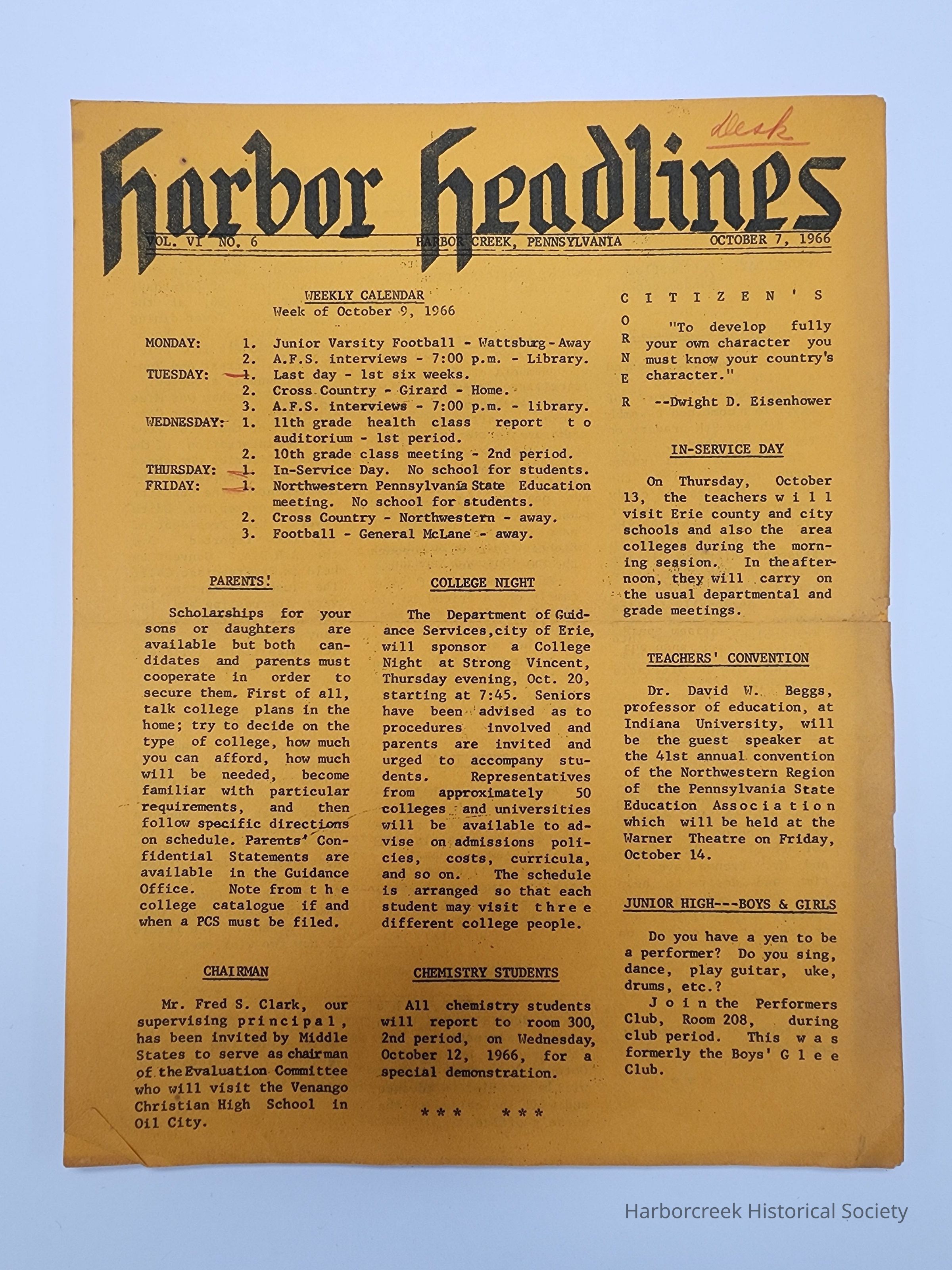 (6) issues of the Harbor Headlines newsletter of the Harbor Creek High School, spanning October 7, 1966 to April 19, 1968. (2024.14.08a-f)Context