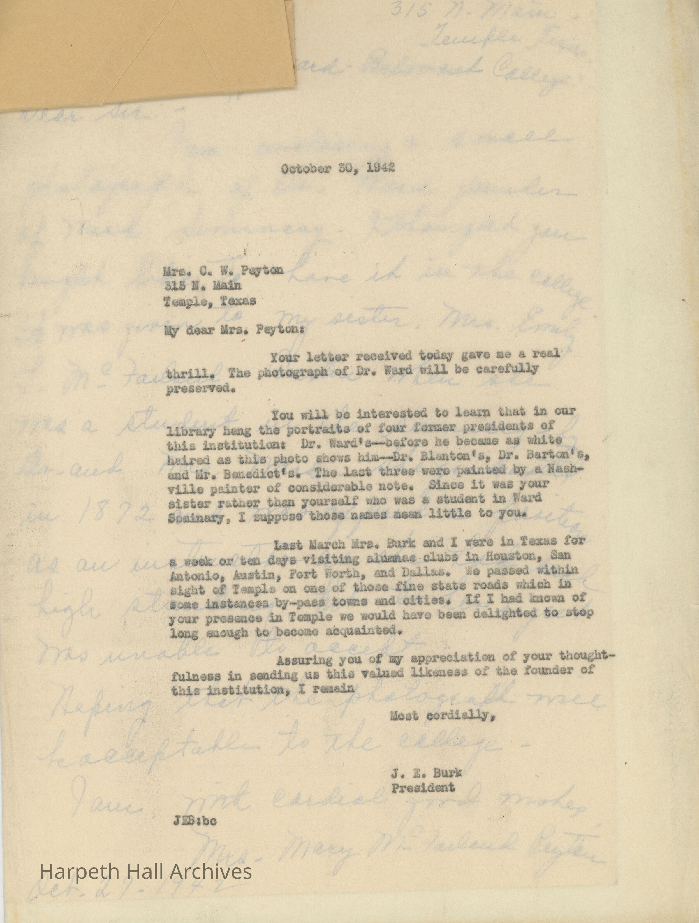 A letter written by the President of Ward-Belmont thanking Mrs. Mary McFarland Peyton for sending a small photograph of Ward Seminary's founder, Dr. William Ward. The letter is dated October 30th, 1948.Collection