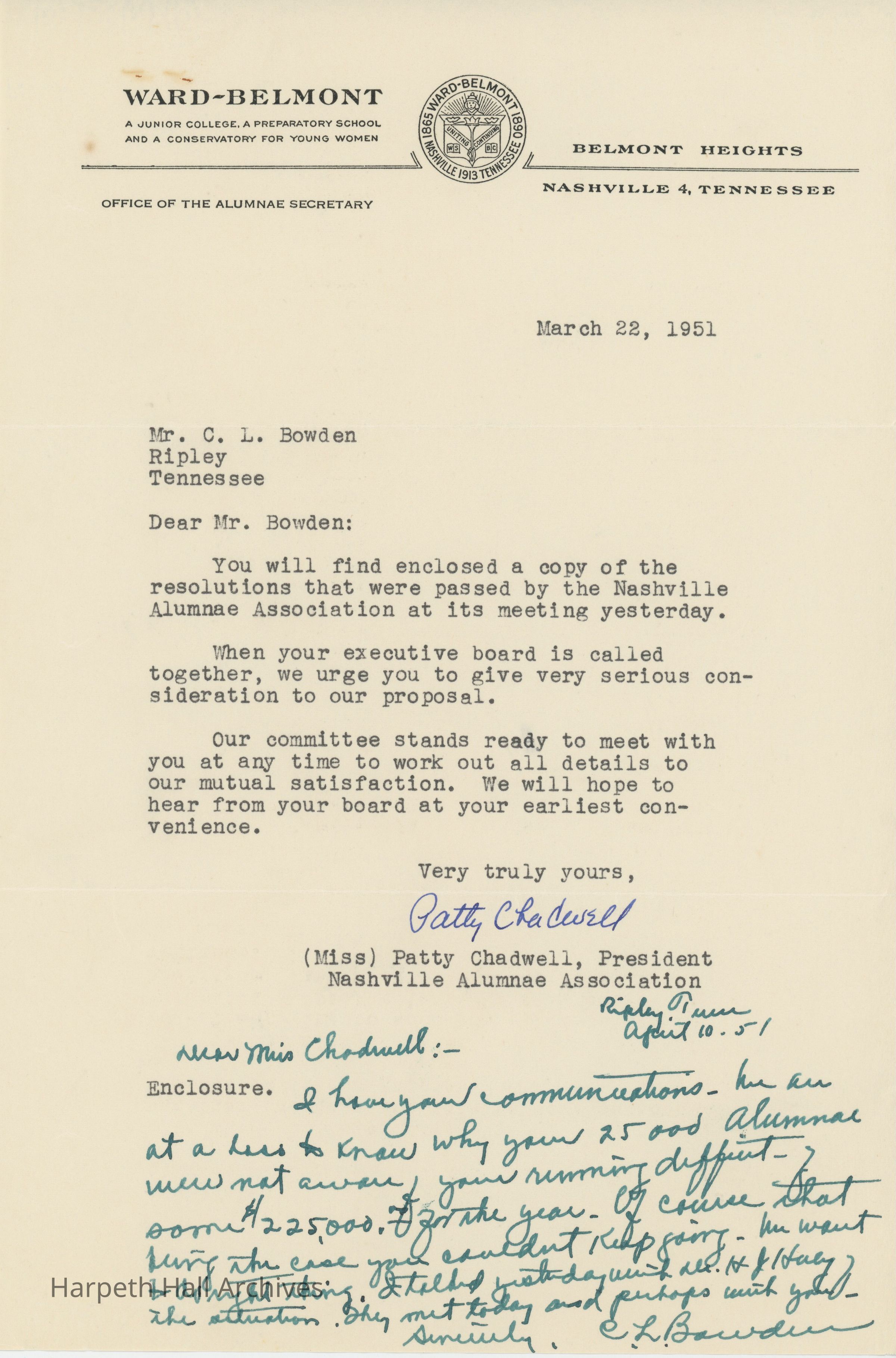 A letter from a member of the TBC Executive Board addressing Patty Chadwell's resolutions. He notes that he is not sure why the Ward-Belmont alumnae were not made aware of the financial status of the school, but at the deficit it was creating, the school would not have been able to function on its own for much longer. He says that the Baptists want to do the right thing in this situation.Collection