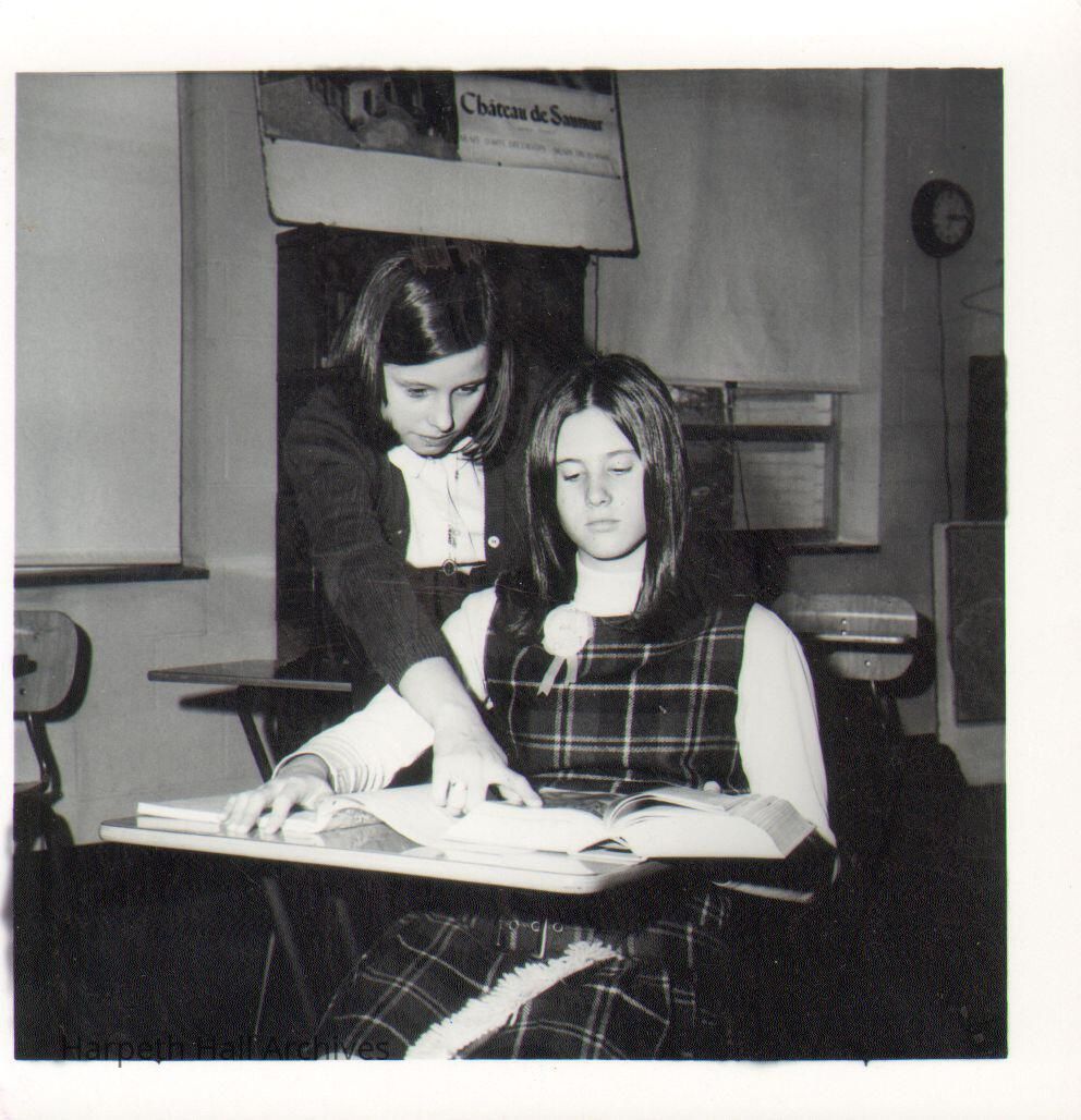 Emmy Greer and Grace Paine study from a book at a desk in 1970.