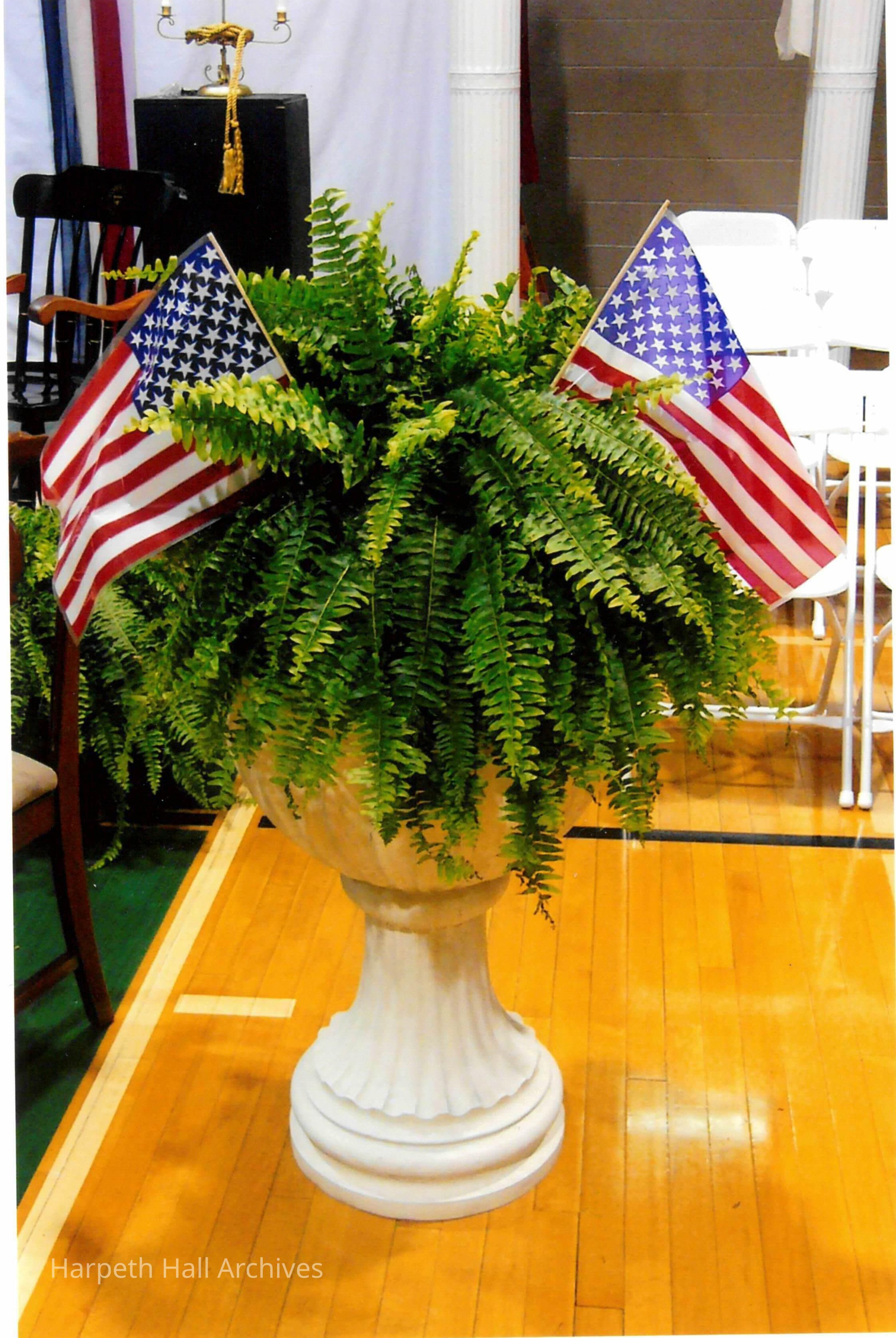 A plant prop with two American flags used in the George Washington Day Celebration.Context
