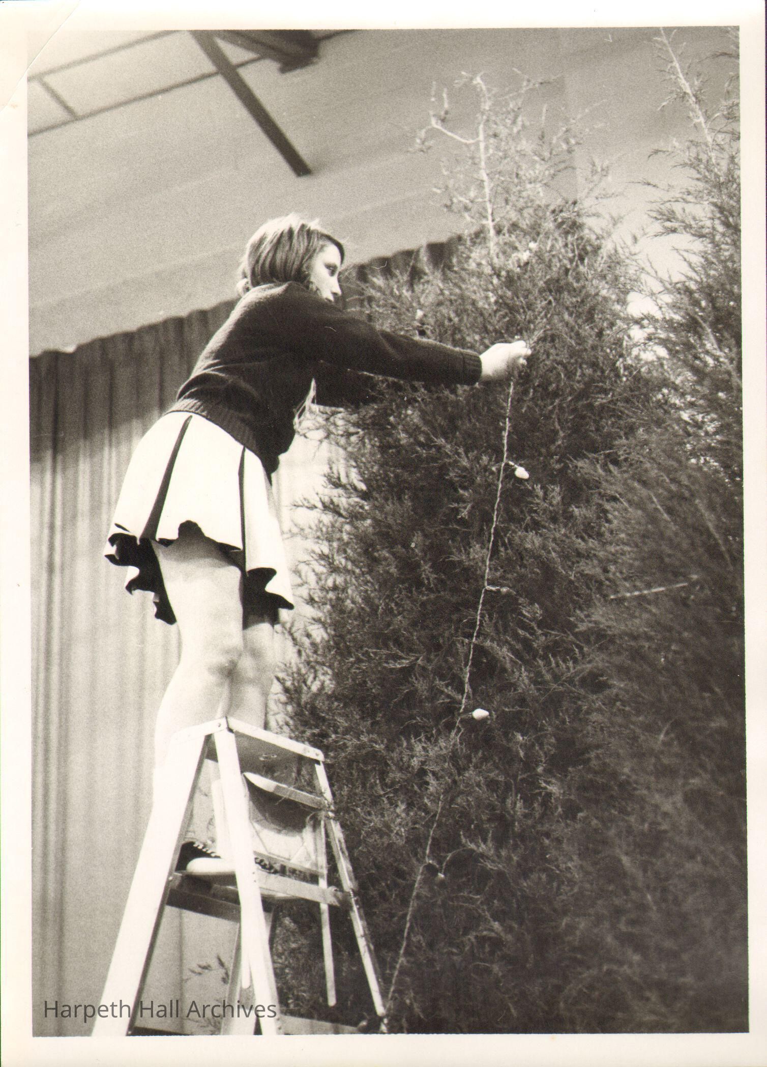 Florence Gifford Blair (1970) strings lights on a Christmas tree in 1970.