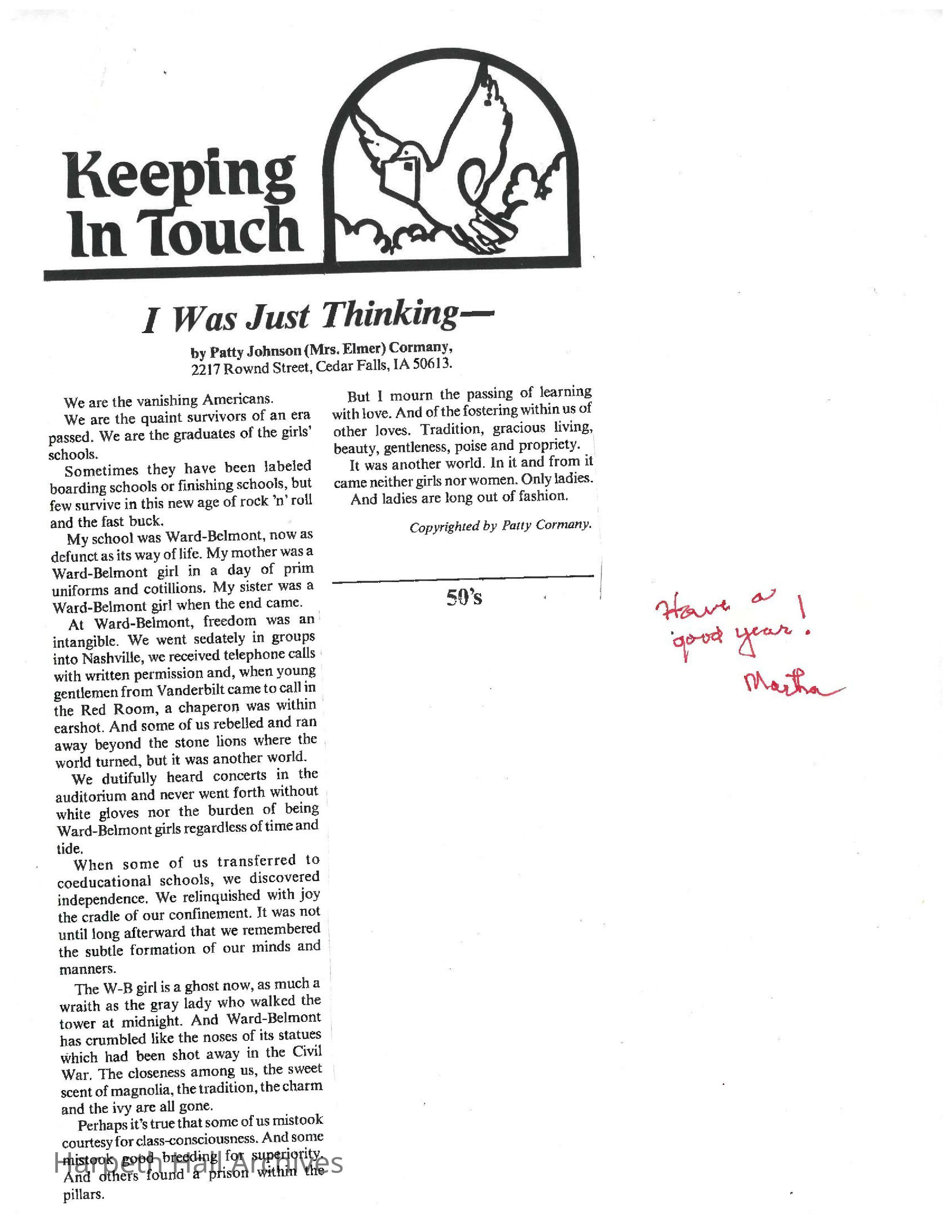 Poem titled "I Was Just Thinking" by Ward-Belmont alumna Patty Johnson Cormany, Class of 1941. Two copies in different formats filed.Collection