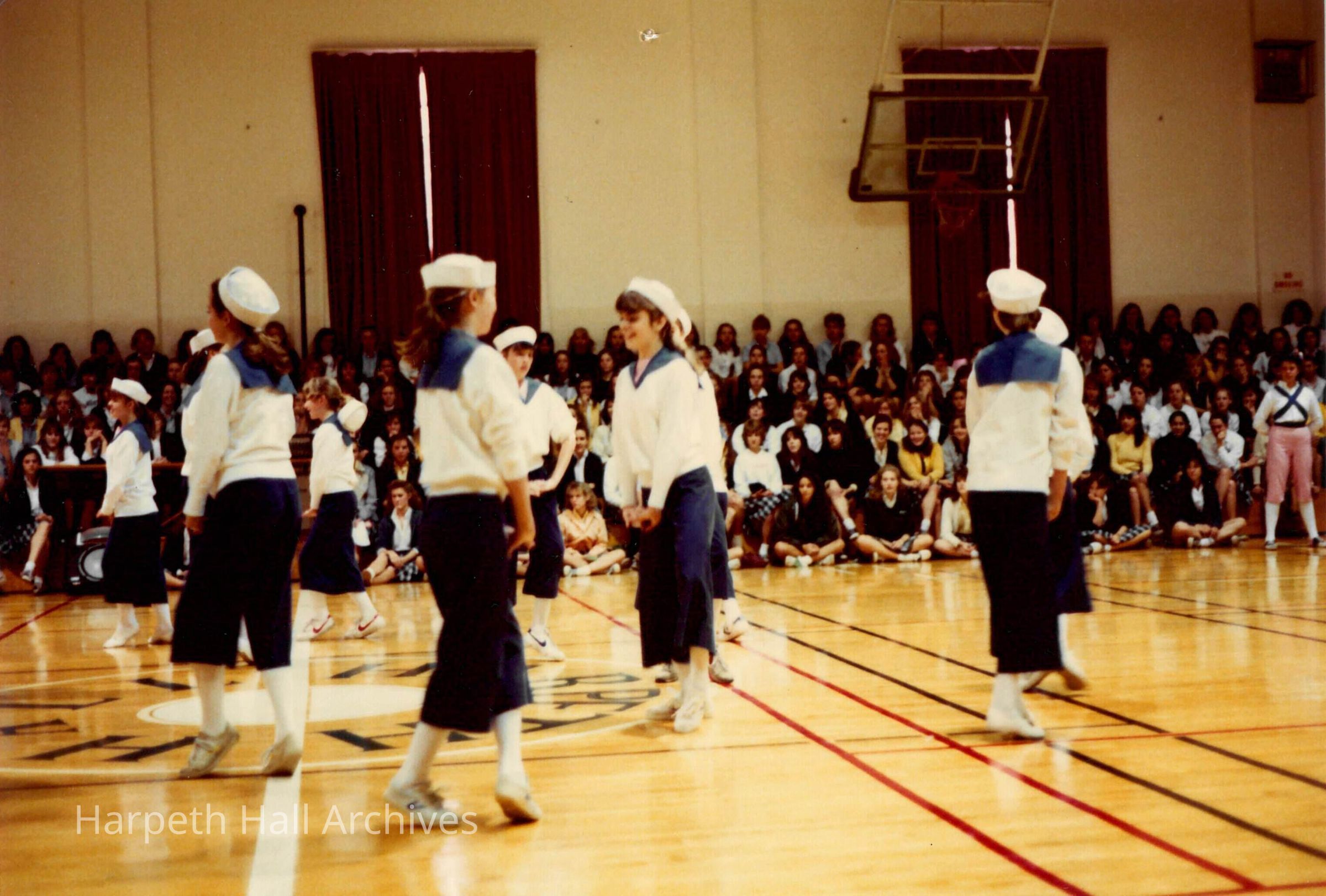 A group of seventh grade students performing as sailors in the George Washington Day Celebration. The photo is taken in the Morrison Gym in the McMurry Center.Context