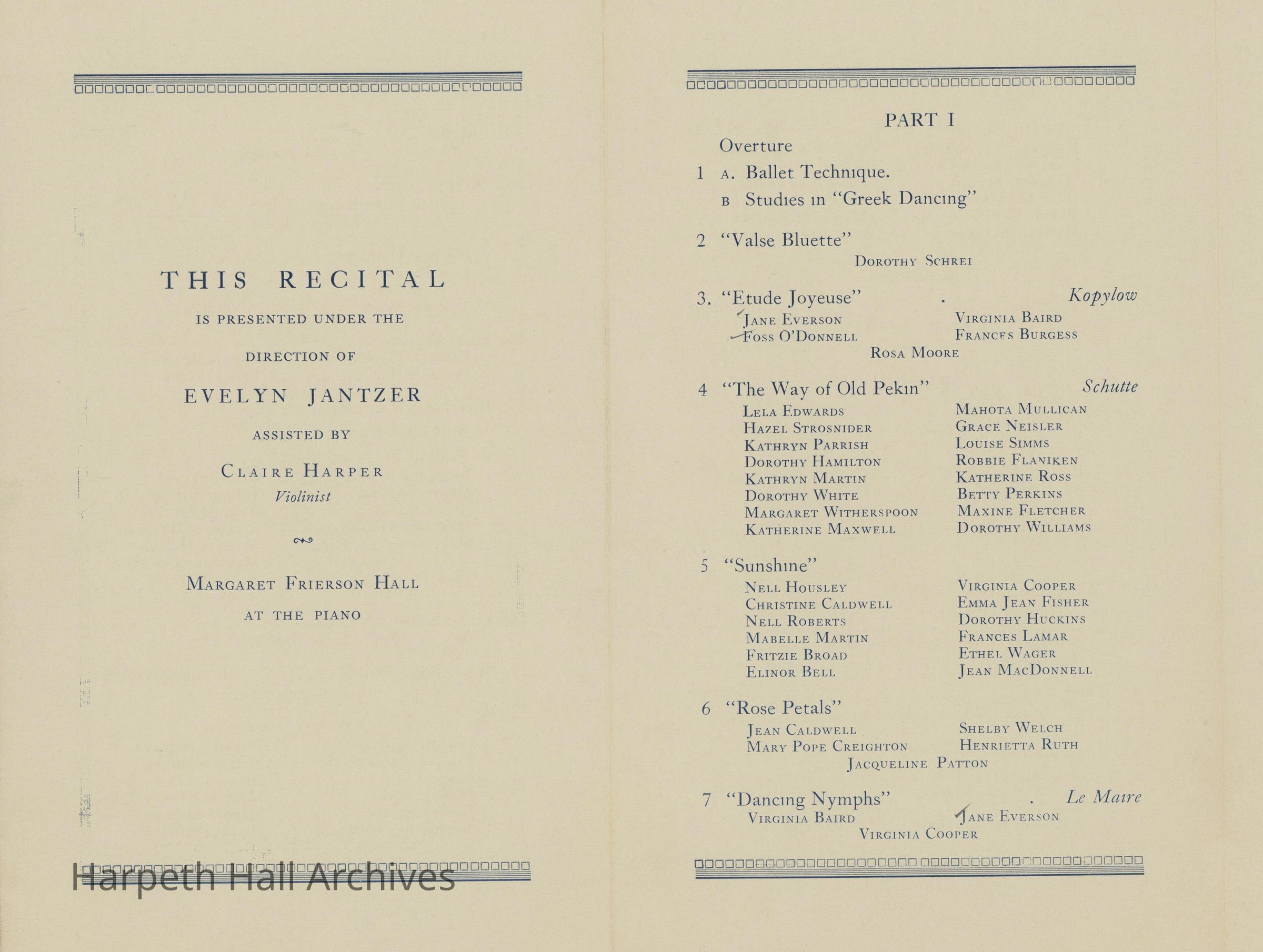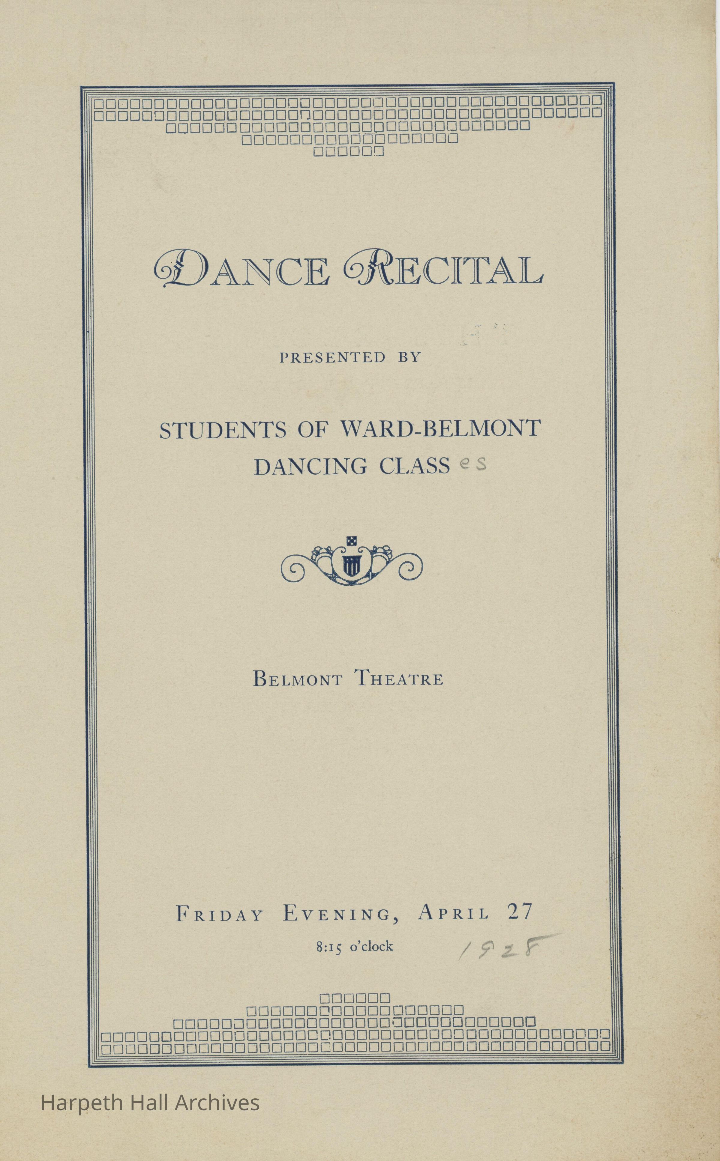 A program for a dance recital presented by students of the Ward-Belmont dancing classes. Held at the Belmont Theatre on Friday evening, April 27, 1928, at 8:15. The recital was presented under the direction of Evelyn Jantzer, assisted by violinist Claire Harper and pianist Margaret Frierson Hall. The names of composers and performers are listed in the program alongside their respective music and dance numbers. Ushers are listed on the back of the program.Context