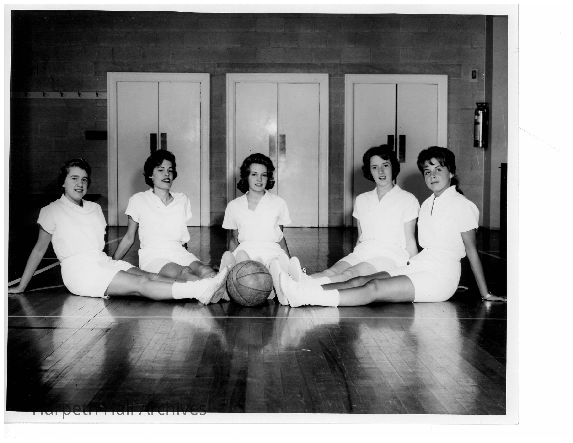 Harpeth Hall students on the 1961 Basketball Varsity team pose on the court around a basketball