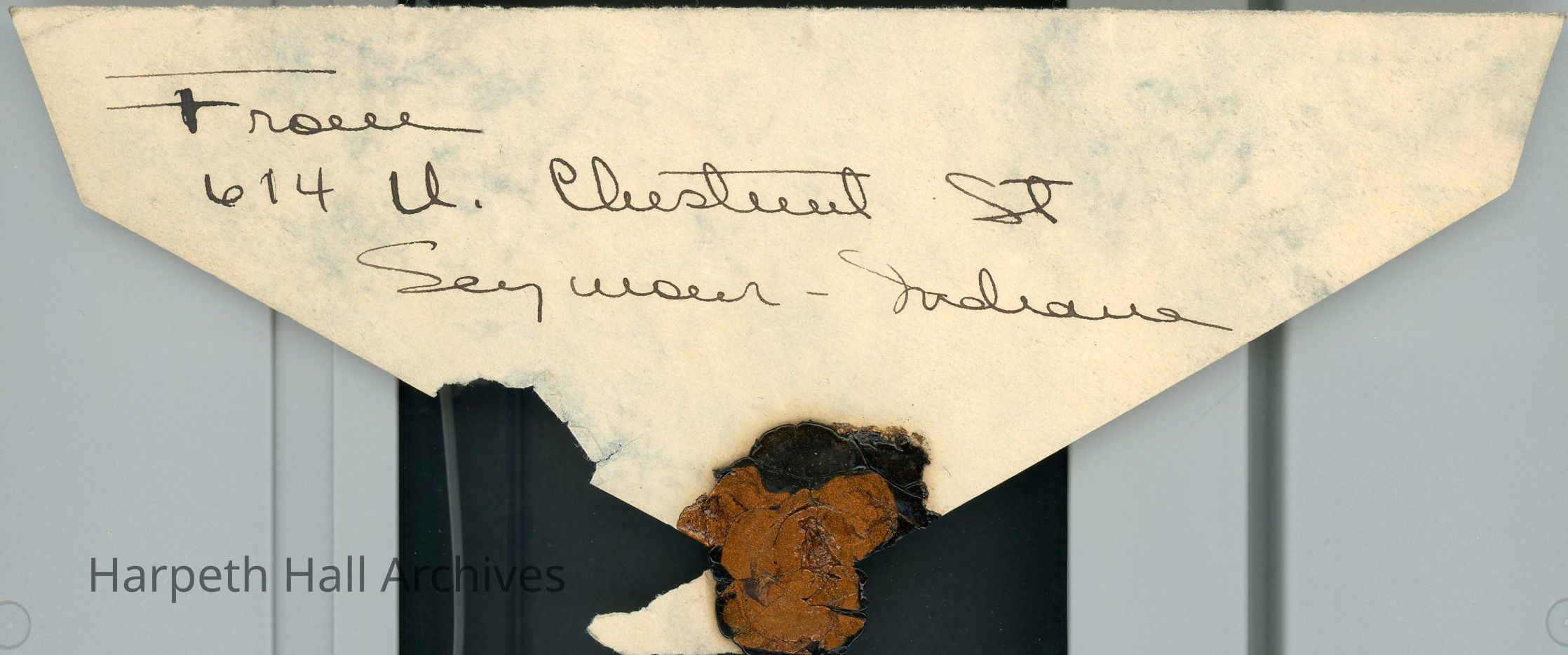 A portion of an envelope with a handwritten address and wax seal. From 614 N. Chestnut St, Seymour, Indiana.Collection