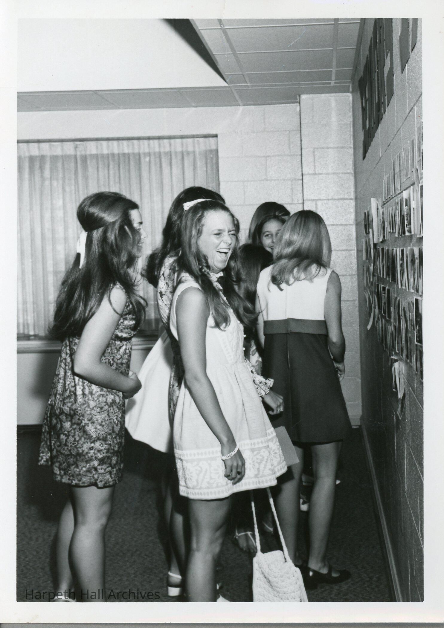 Margaret "Peggy" Craig (1971) laughs at a wall of photos in 1971.