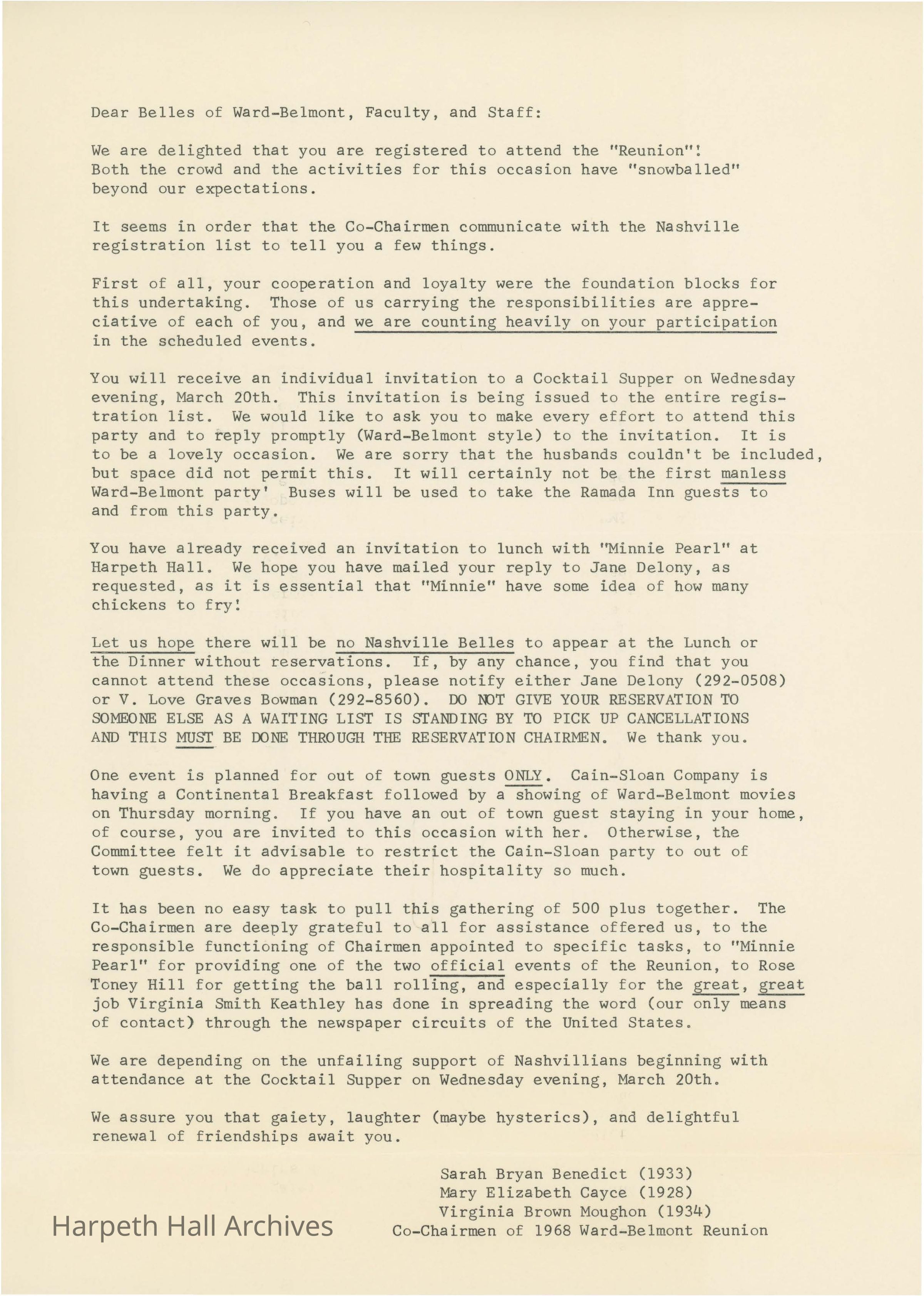 Letter to registered attendees of the 1968 Ward Belmont Reunion