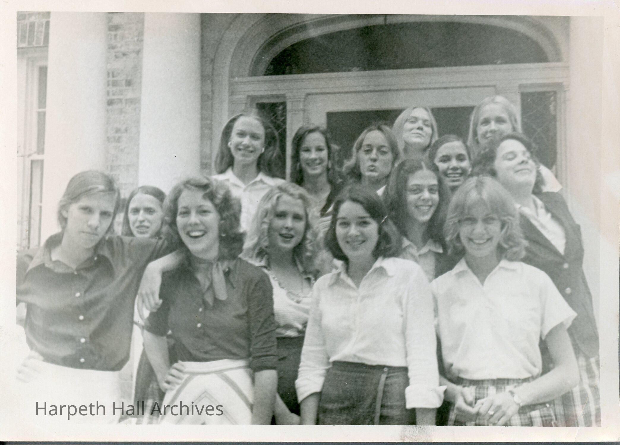 Group of students in the 1970's pose outside Souby Hall for a photo.