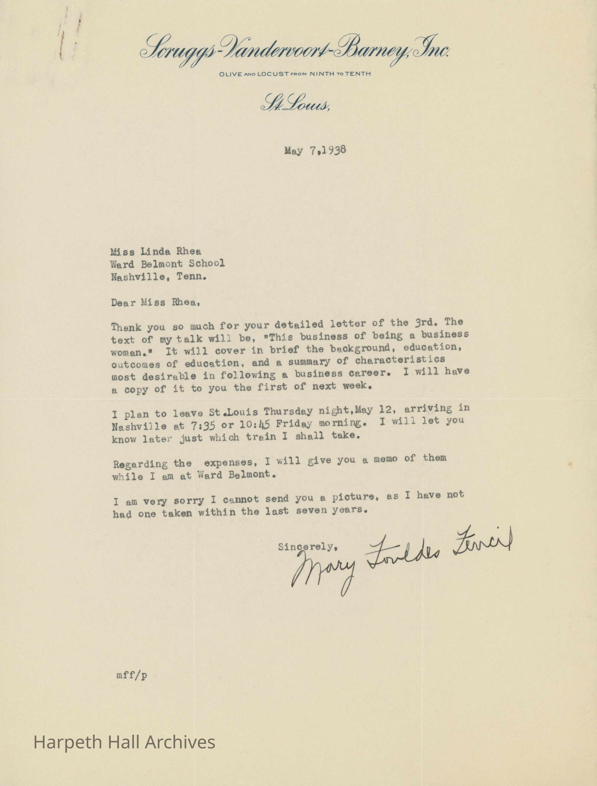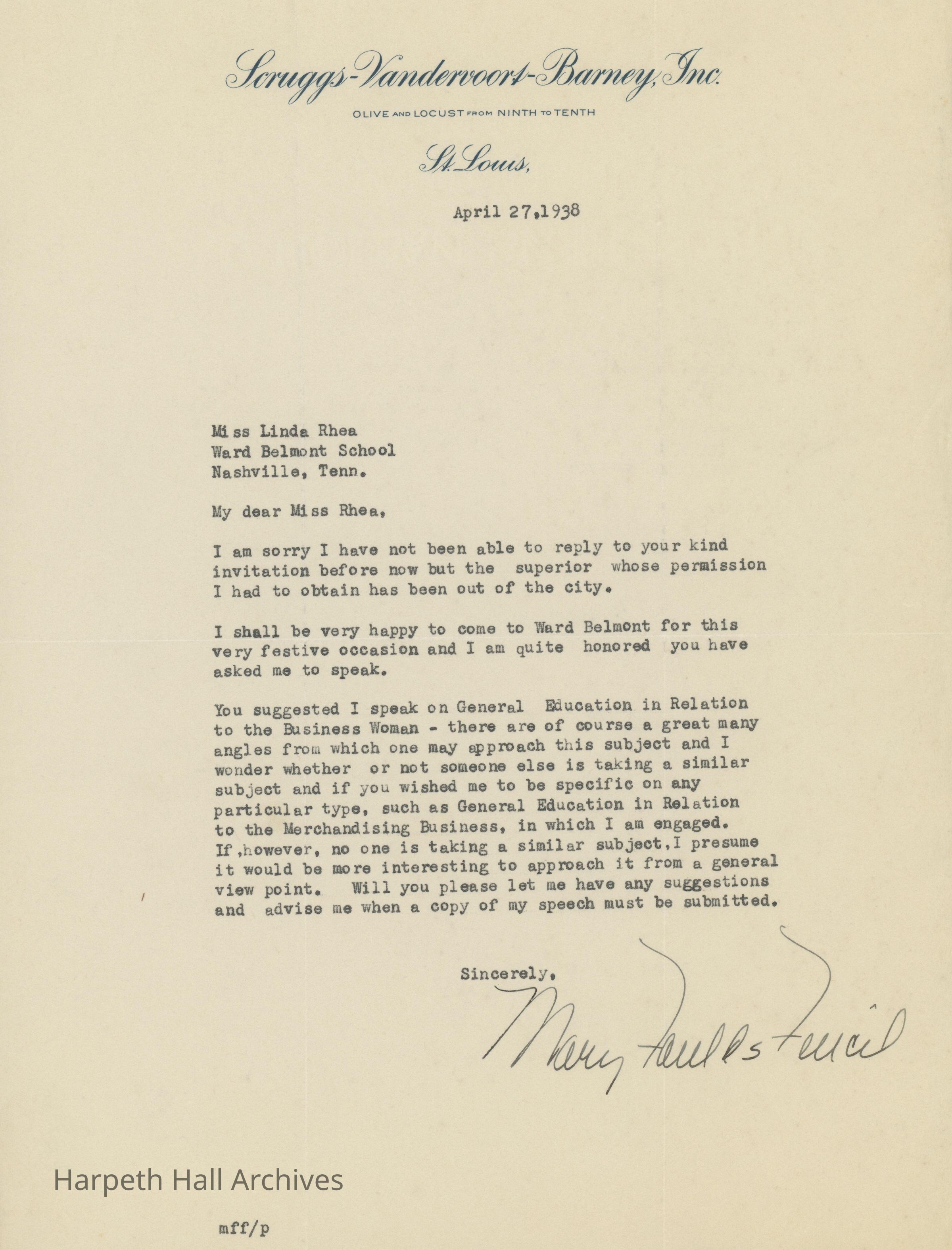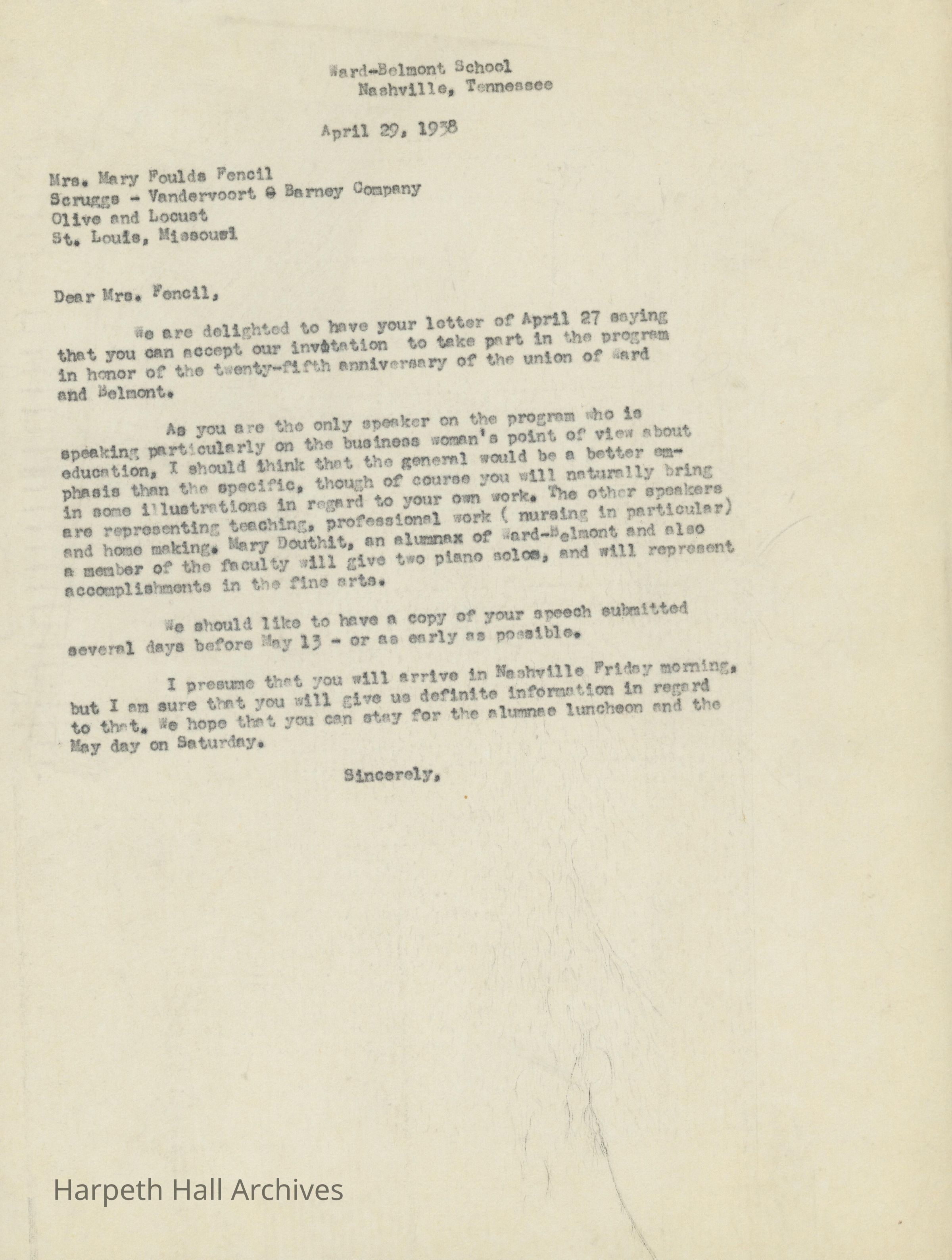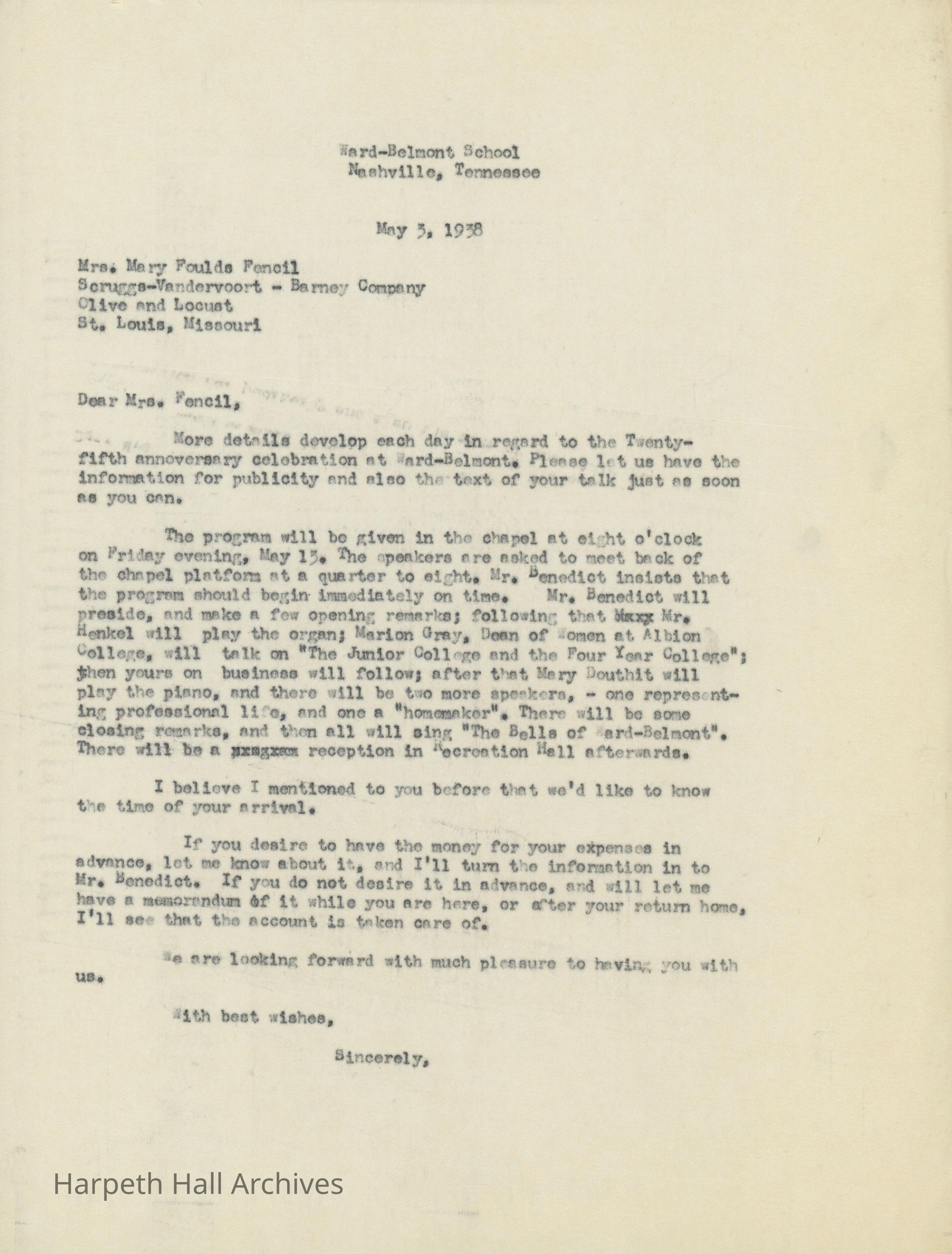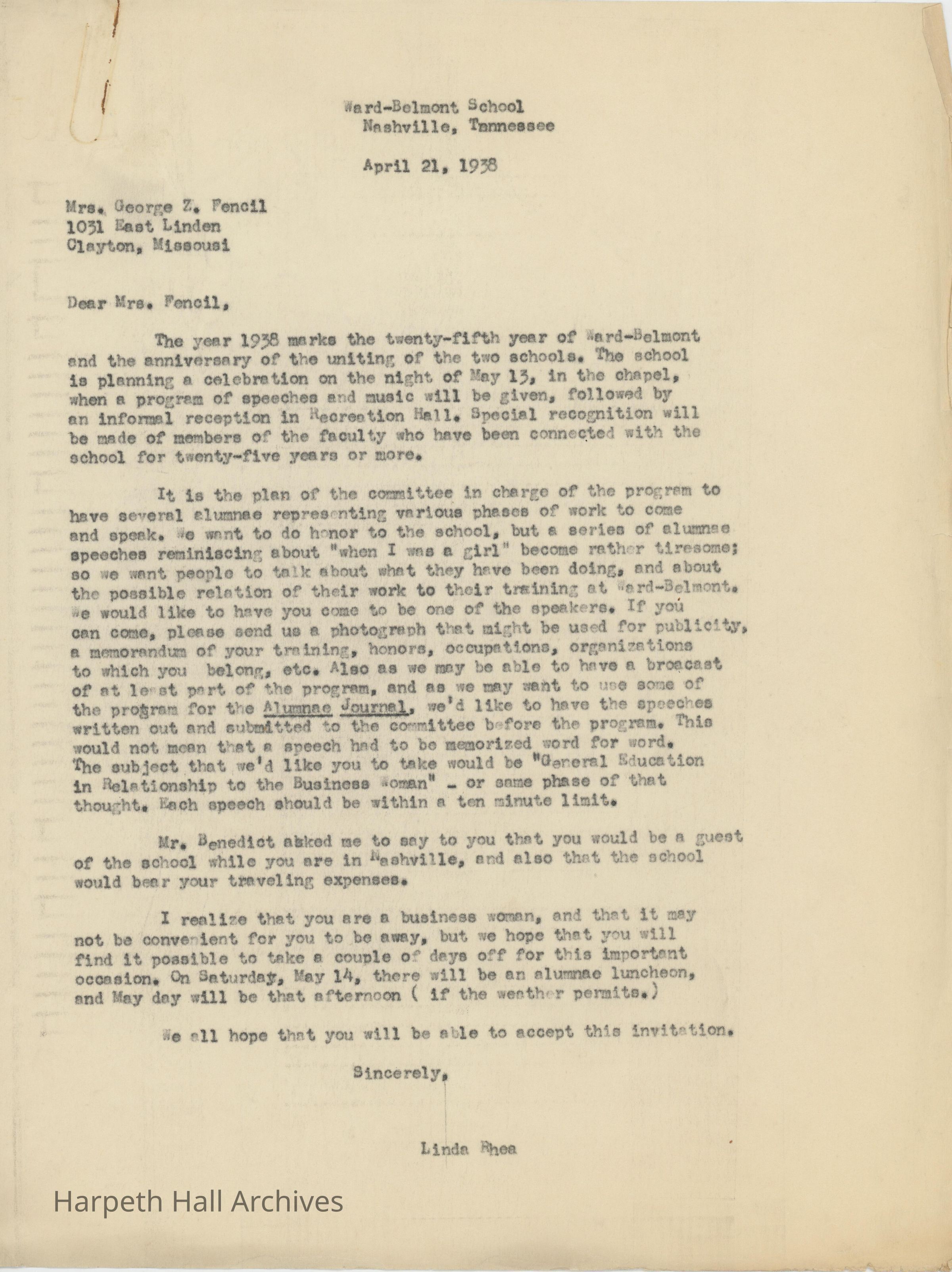 Letters between Linda Rhea and Mary Foulds Fencil regarding the 25th Ward-Belmont Anniversary in 1938.Collection